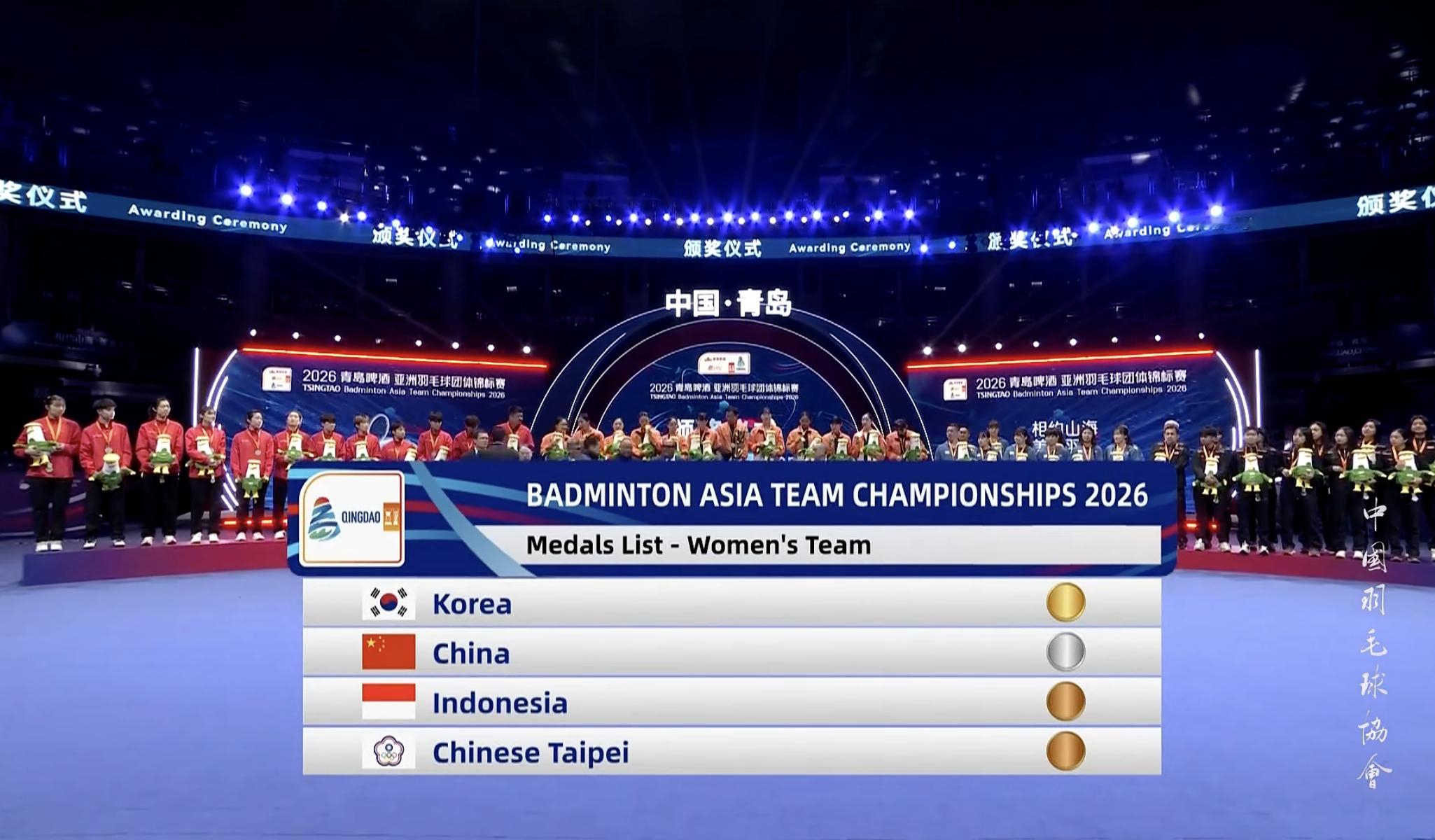 🏆女团冠军:韩国队🇰🇷🥈女团亚军:中国队🇨🇳🥉女团季军:中国台北、印尼队🇮🇩恭喜各位!!!🎉🎉🎉中国羽毛球队2026亚洲羽毛球团体锦标赛