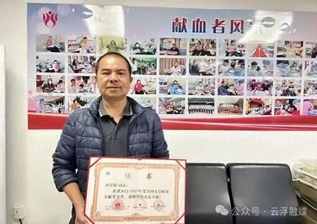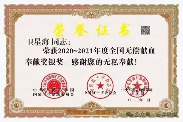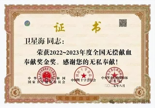 卫星海同志是云浮市卫生健康局的职工,自1999年开始积极参加无偿献血。截至2026年1月,累计献血27次,献血总量达9000毫升,荣获“2022-2023年度全国无偿献血奉献奖金奖”。