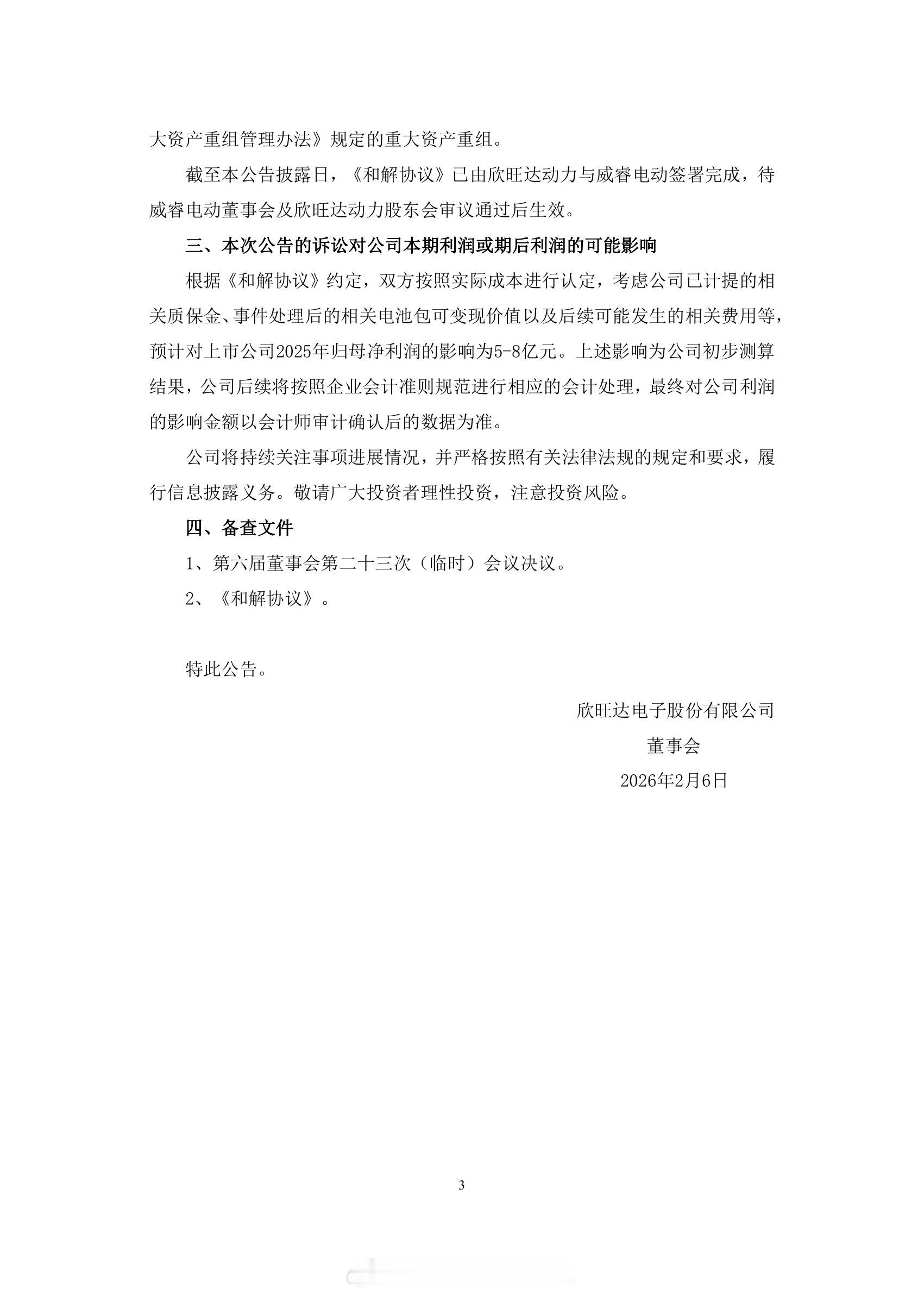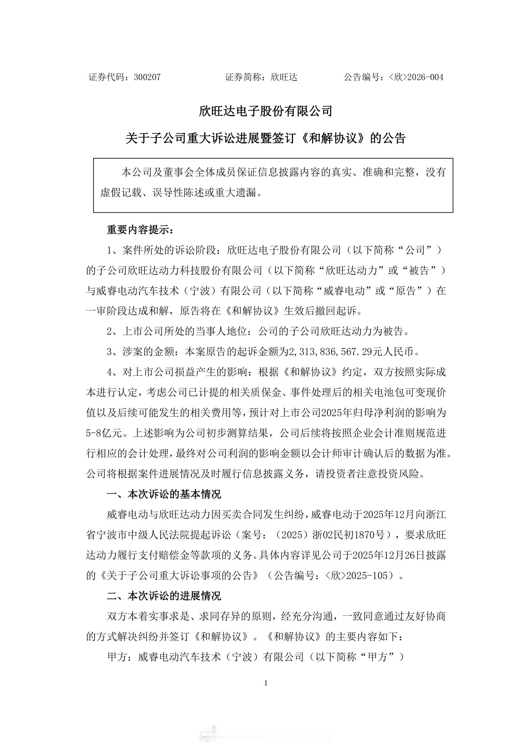 之前欣旺达和极氪(吉利)之前的诉讼案有了新进展:2月6日,欣旺达发布公告称,欣旺达的子公司欣旺达动力科技股份有限公司与吉利系公司威睿电动汽车技术(宁波)有限公司在一审阶段达成和解,后者将在《和解协议》生效后撤回起诉。双方同意对于更换动力电池包相关的费用按照实际成本进行认定,根据实际发生金额经双方核对后确认,双方商定按比例分担该实际发生金额,同时,事件处理后的相关电池包全部归欣旺达所有。