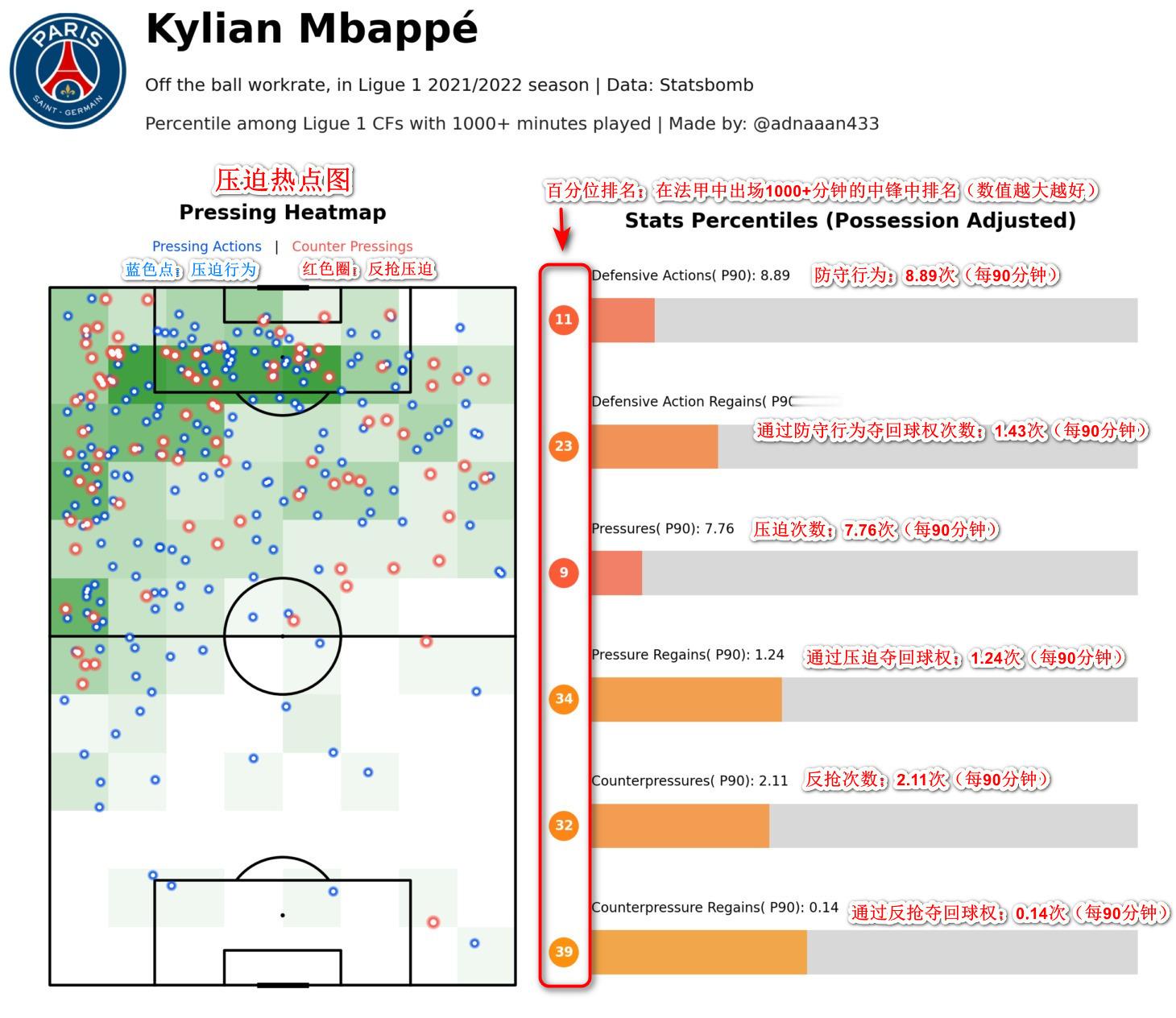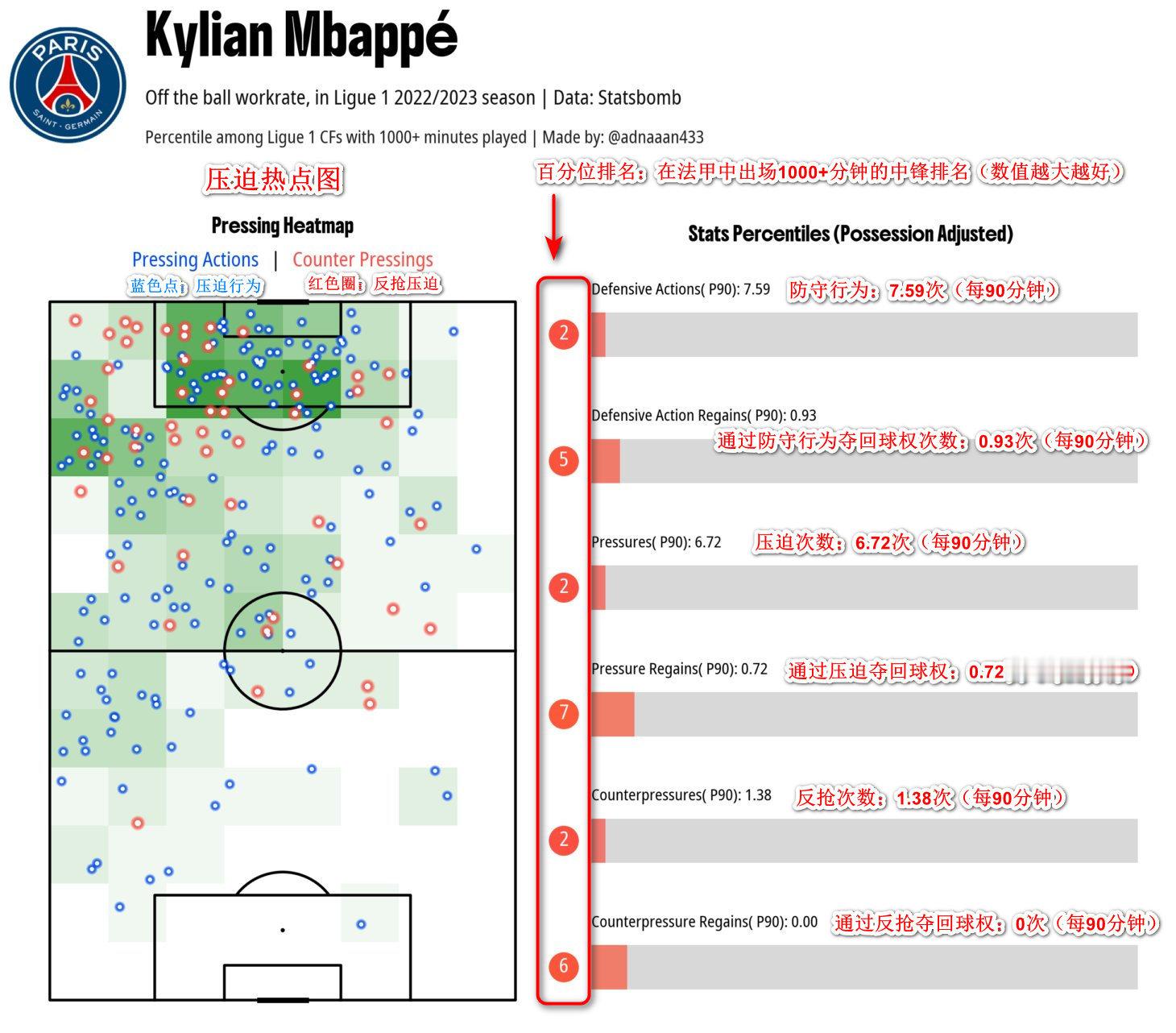 从图中可以看出梅西在22/23赛季在场上的实际位置和活动区域发生了明显变化,更加靠近禁区。而梅西的数据基准也从边锋切换到了中锋,同样都是以中锋为基准,梅西在球队的无球防守、逼抢表现、中锋百分位排名都明显优于姆巴佩。