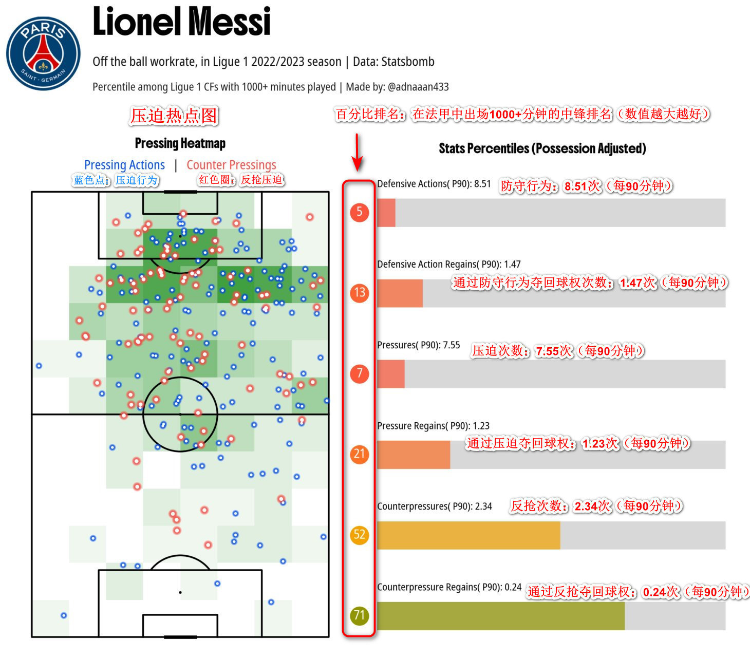 梅西在巴黎期间,无论是在压迫覆盖范围,还是在球队整体防守参与度、以及防守成功率都要比姆巴佩更积极,更有效。