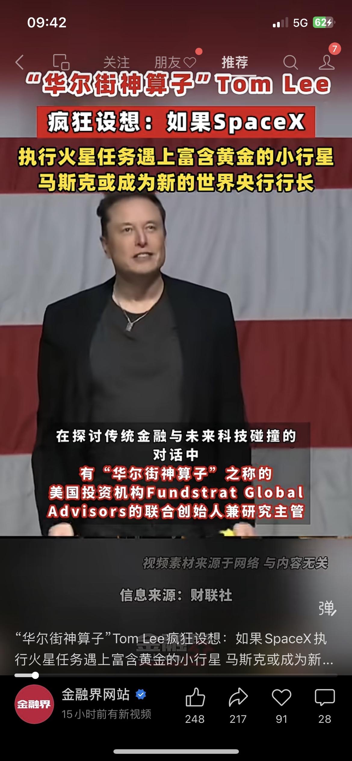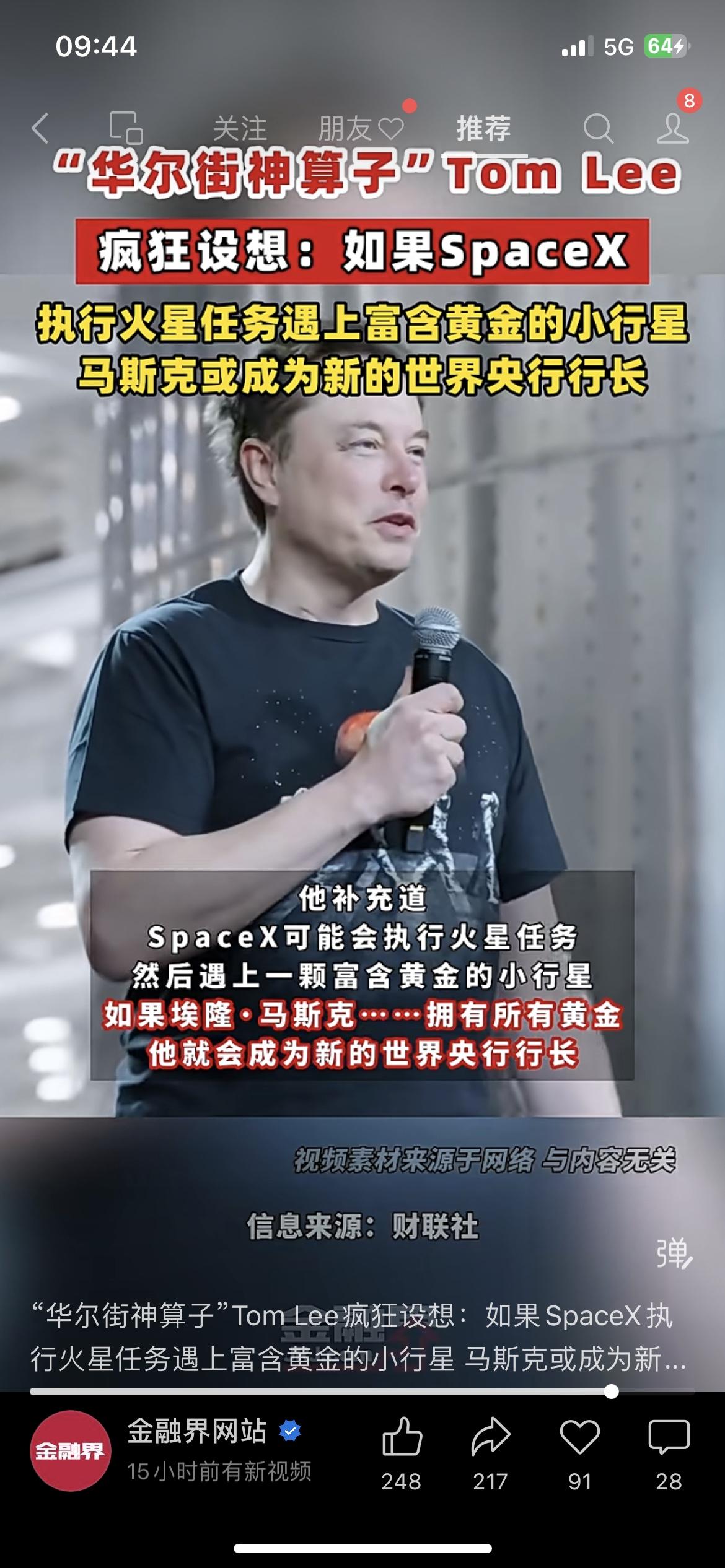 华尔街狂想:马斯克挖到黄金小行星,能当全球央行行长? SpaceX+黄金+货币霸权,脑洞越大,越能看出未来财富逻辑的巨变。 顶级财富的尽头,是重新定义规则。 你觉得这是天方夜谭,还是未来真有可能? 马斯克 财经脑洞 黄金理财
