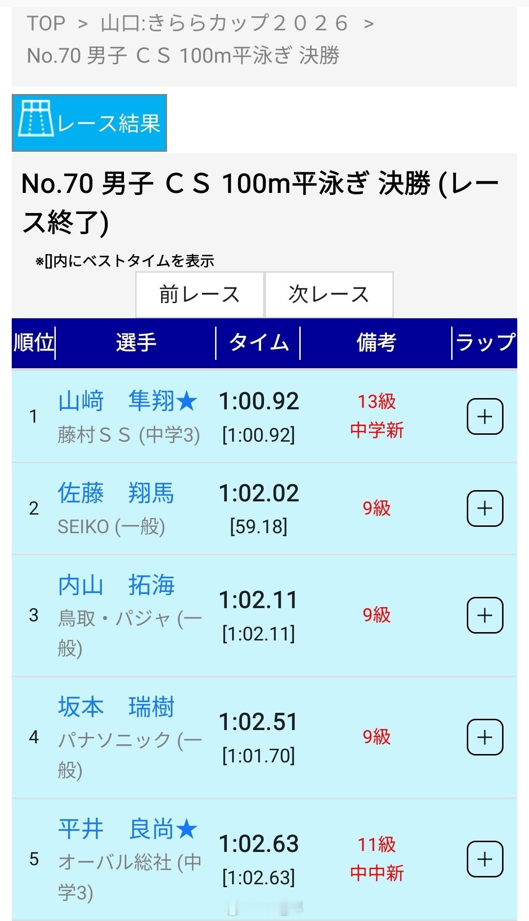 Kirara Cup 日本男蛙人才储备羡慕了男100蛙山崎隼翔(10) 1:00.92 日本中学纪录男200蛙大桥信(09)2:08.98平井良尚(10)2:11.71