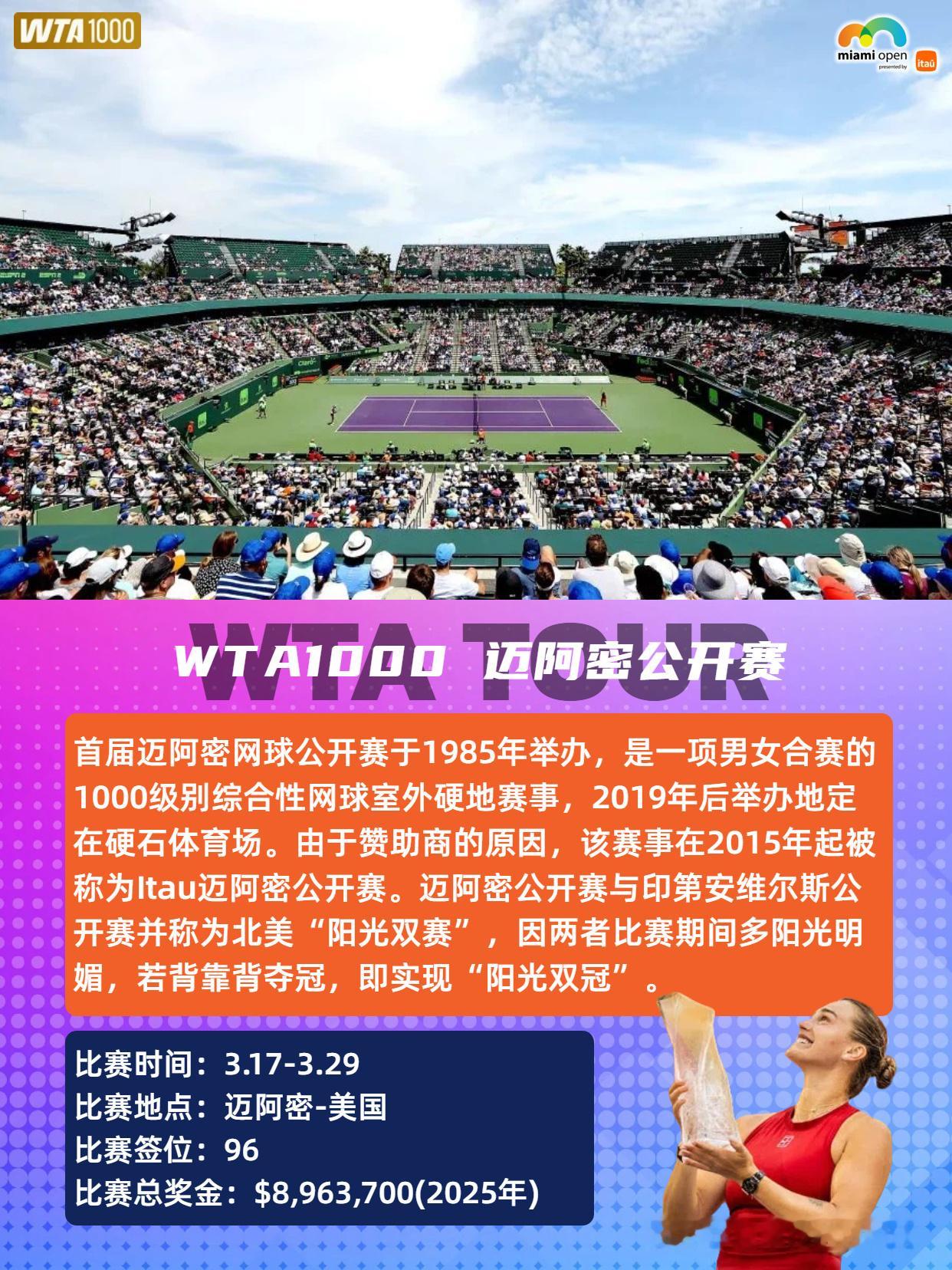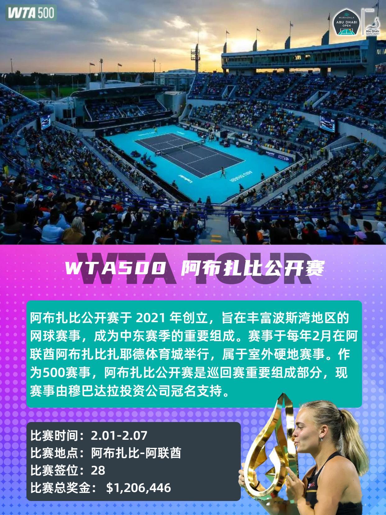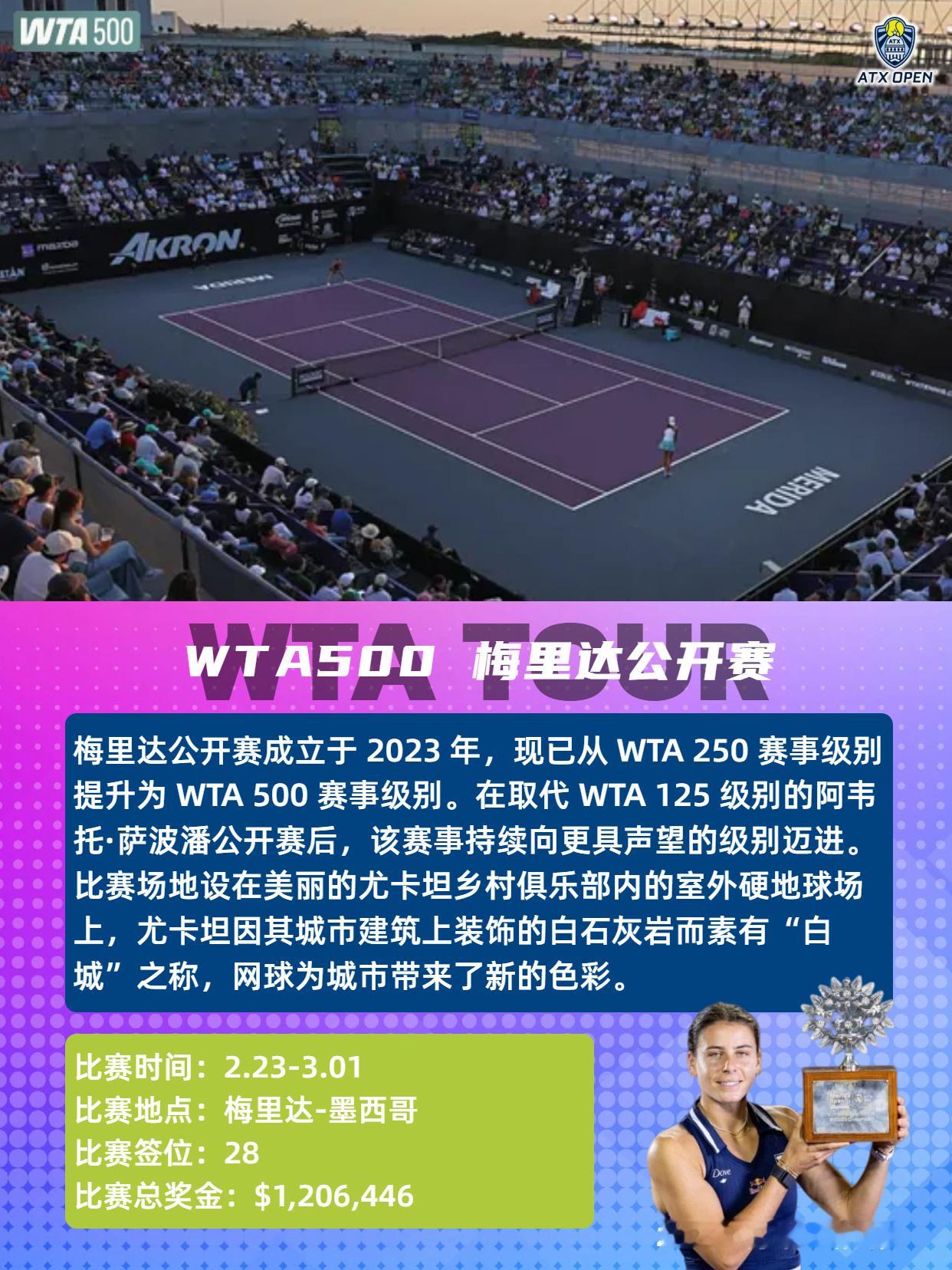 整理了WTA中东及上半年北美赛季的观赛日历,本阶段共有8站赛事,包含4站1000赛、3站500赛和1站250赛;从产地类型划分,包括7站硬地和1站土地赛事。1️⃣WTA500阿布扎比公开赛比赛时间:2.01-2.07比赛场地:室外硬地比赛地点:阿布扎比-🇦🇪阿联酋单打签位:28(前4种子首轮轮空)赛事总奖金:$12064462026年冠军:🇨🇿贝莱克2️⃣WTA1000卡塔尔公开赛比赛时间:2.08-2.14比赛场地:室外硬地比赛地点:多哈-🇶🇦卡塔尔单打签位:56(前8种子首轮轮空)赛事总奖金:$40882112025年冠军:🇺🇸阿尼西莫娃3️⃣WTA1000迪拜锦标赛比赛时间:2.15-2.21比赛遍地:室外硬地比赛地点:迪拜-🇦🇪阿联酋单打签位:56(前8种子首轮轮空)赛事总奖金:$40882112025年冠军:🇷🇺安德烈耶娃4️⃣WTA500梅里达公开赛比赛时间:2.23-3.01比赛场地:室外硬地比赛地点:梅里达-🇲🇽墨西哥单打签位:28(前4种子首轮轮空)赛事总奖金:$12064462025年冠军:🇺🇸纳瓦罗5️⃣WTA250奥斯汀公开赛比赛时间:2.23-3.01比赛场地:室外硬地比赛地点:奥斯汀-🇺🇸美国单打签位:32赛事总奖金:$2833472025年冠军:🇺🇸佩古拉6️⃣WTA1000印第安维尔斯公开赛比赛时间:3.04-3.15比赛场地:室外硬地比赛地点:印第安维尔斯-🇺🇸美国单打签位:96(前32种子首轮轮空)赛事总奖金:$9489532(2025年)2025年冠军:🇷🇺安德烈耶娃7️⃣WTA1000迈阿密公开赛比赛时间:3.17-3.29比赛场地:室外硬地比赛地点:迈阿密-🇺🇸美国单打签位:96(前32种子首轮轮空)赛事总奖金:$8963700(2025年)2025年冠军:🇧🇾萨巴伦卡8️⃣WTA500查尔斯顿公开赛比赛时间:3.31-4.05比赛场地:室外绿土比赛地点:查尔斯顿-🇺🇸美国单打签位:48(前16种子首轮轮空)赛事总奖金:$10645102025年冠军:🇺🇸佩古拉
