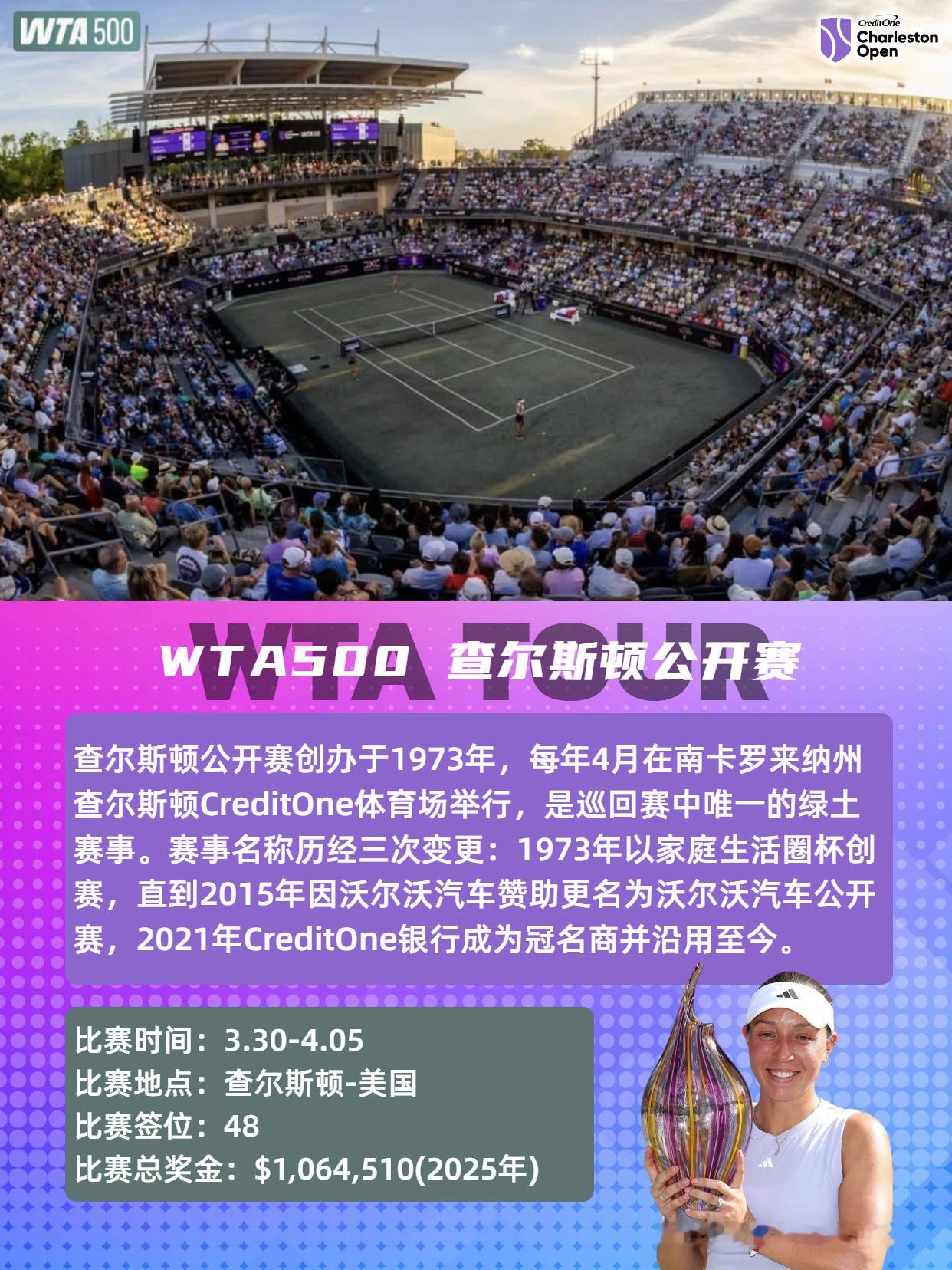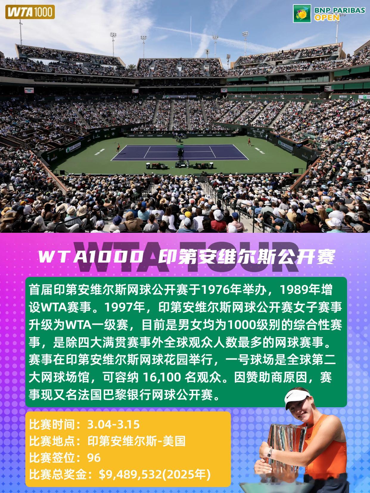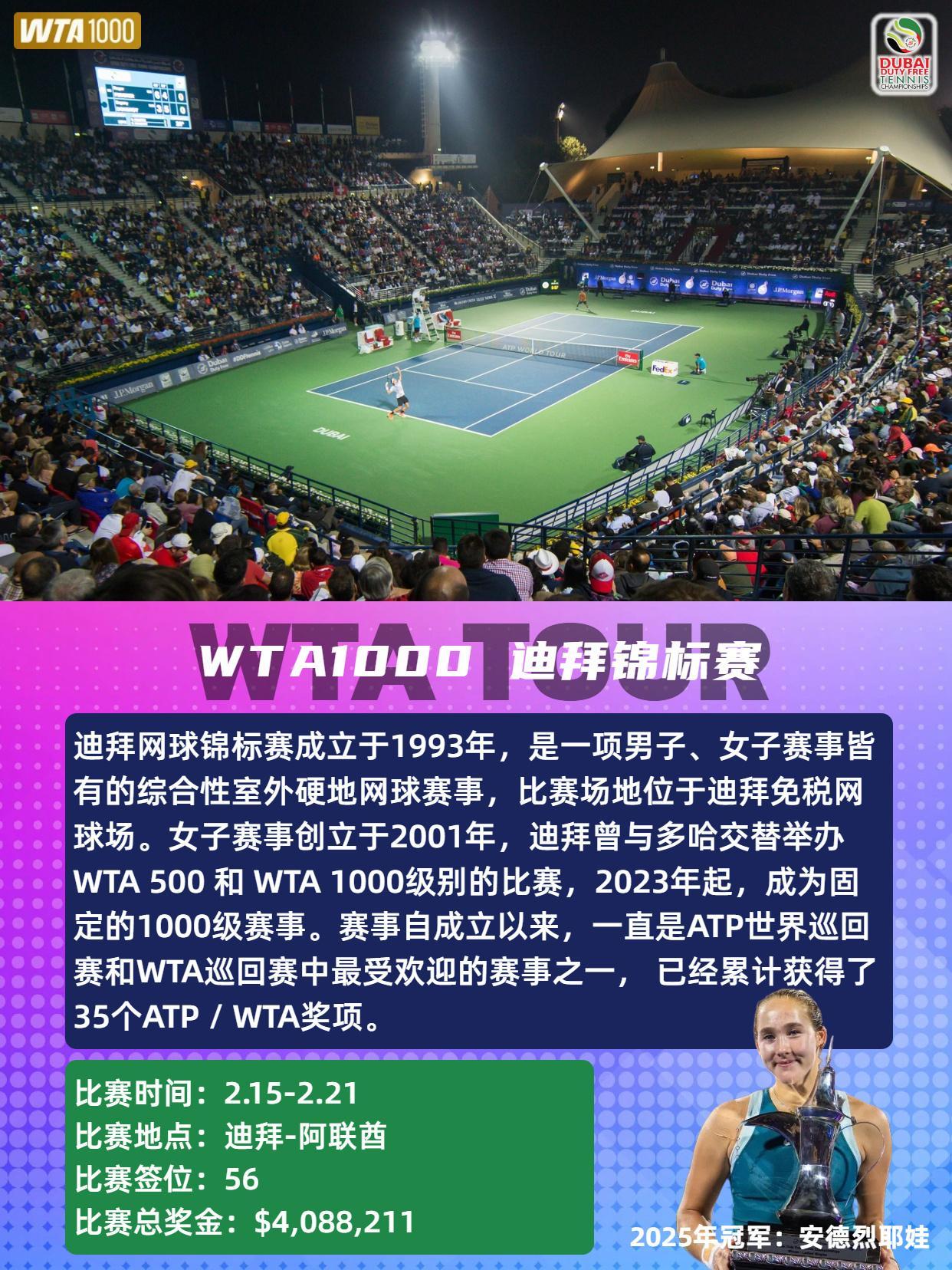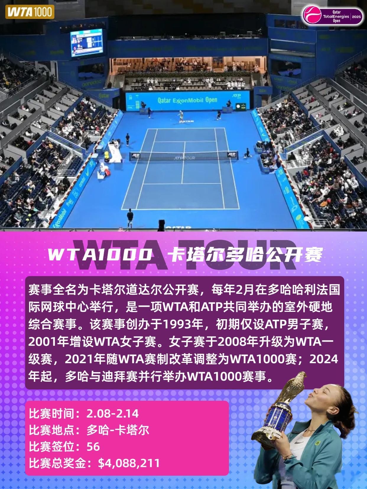 整理了WTA中东及上半年北美赛季的观赛日历,本阶段共有8站赛事,包含4站1000赛、3站500赛和1站250赛;从产地类型划分,包括7站硬地和1站土地赛事。1️⃣WTA500阿布扎比公开赛比赛时间:2.01-2.07比赛场地:室外硬地比赛地点:阿布扎比-🇦🇪阿联酋单打签位:28(前4种子首轮轮空)赛事总奖金:$12064462026年冠军:🇨🇿贝莱克2️⃣WTA1000卡塔尔公开赛比赛时间:2.08-2.14比赛场地:室外硬地比赛地点:多哈-🇶🇦卡塔尔单打签位:56(前8种子首轮轮空)赛事总奖金:$40882112025年冠军:🇺🇸阿尼西莫娃3️⃣WTA1000迪拜锦标赛比赛时间:2.15-2.21比赛遍地:室外硬地比赛地点:迪拜-🇦🇪阿联酋单打签位:56(前8种子首轮轮空)赛事总奖金:$40882112025年冠军:🇷🇺安德烈耶娃4️⃣WTA500梅里达公开赛比赛时间:2.23-3.01比赛场地:室外硬地比赛地点:梅里达-🇲🇽墨西哥单打签位:28(前4种子首轮轮空)赛事总奖金:$12064462025年冠军:🇺🇸纳瓦罗5️⃣WTA250奥斯汀公开赛比赛时间:2.23-3.01比赛场地:室外硬地比赛地点:奥斯汀-🇺🇸美国单打签位:32赛事总奖金:$2833472025年冠军:🇺🇸佩古拉6️⃣WTA1000印第安维尔斯公开赛比赛时间:3.04-3.15比赛场地:室外硬地比赛地点:印第安维尔斯-🇺🇸美国单打签位:96(前32种子首轮轮空)赛事总奖金:$9489532(2025年)2025年冠军:🇷🇺安德烈耶娃7️⃣WTA1000迈阿密公开赛比赛时间:3.17-3.29比赛场地:室外硬地比赛地点:迈阿密-🇺🇸美国单打签位:96(前32种子首轮轮空)赛事总奖金:$8963700(2025年)2025年冠军:🇧🇾萨巴伦卡8️⃣WTA500查尔斯顿公开赛比赛时间:3.31-4.05比赛场地:室外绿土比赛地点:查尔斯顿-🇺🇸美国单打签位:48(前16种子首轮轮空)赛事总奖金:$10645102025年冠军:🇺🇸佩古拉