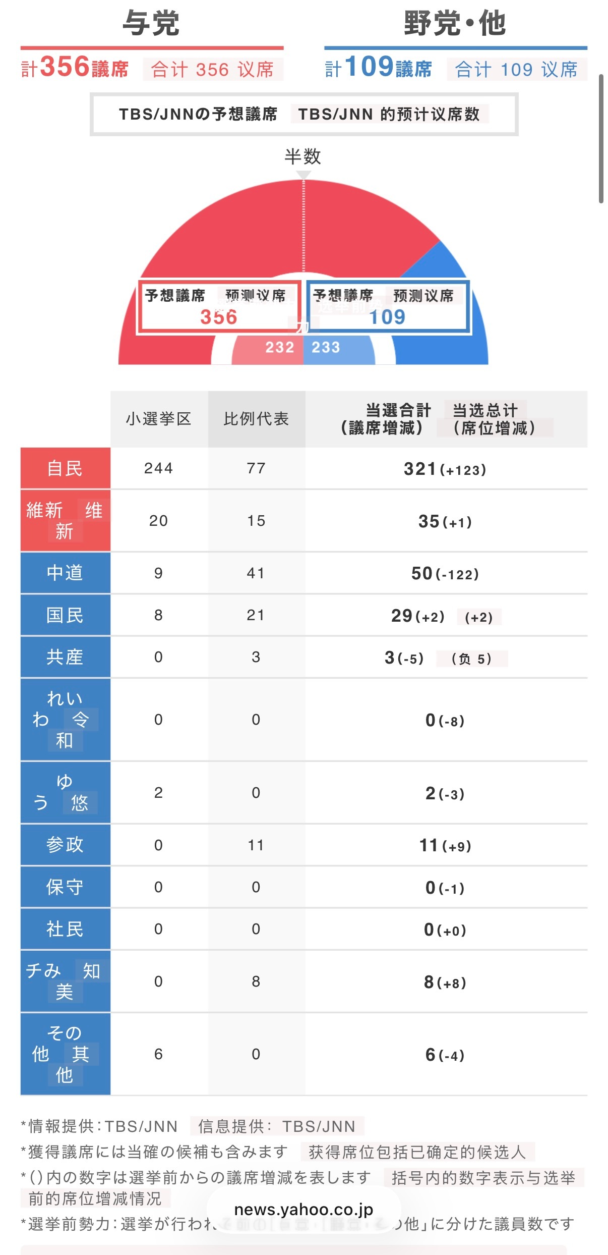 🔻日本的极右翼势力在此次选举中也取得了显著进展。先前他们在众议院仅有 2 个席位,而多家媒体预测,目前他们至少将获得 10 个席位,甚至可能高达 16 个。🔻令和新选组在预测中清零了。🔻via TBS日本执政联盟将获众议院过半议席海外新鲜事热点现场