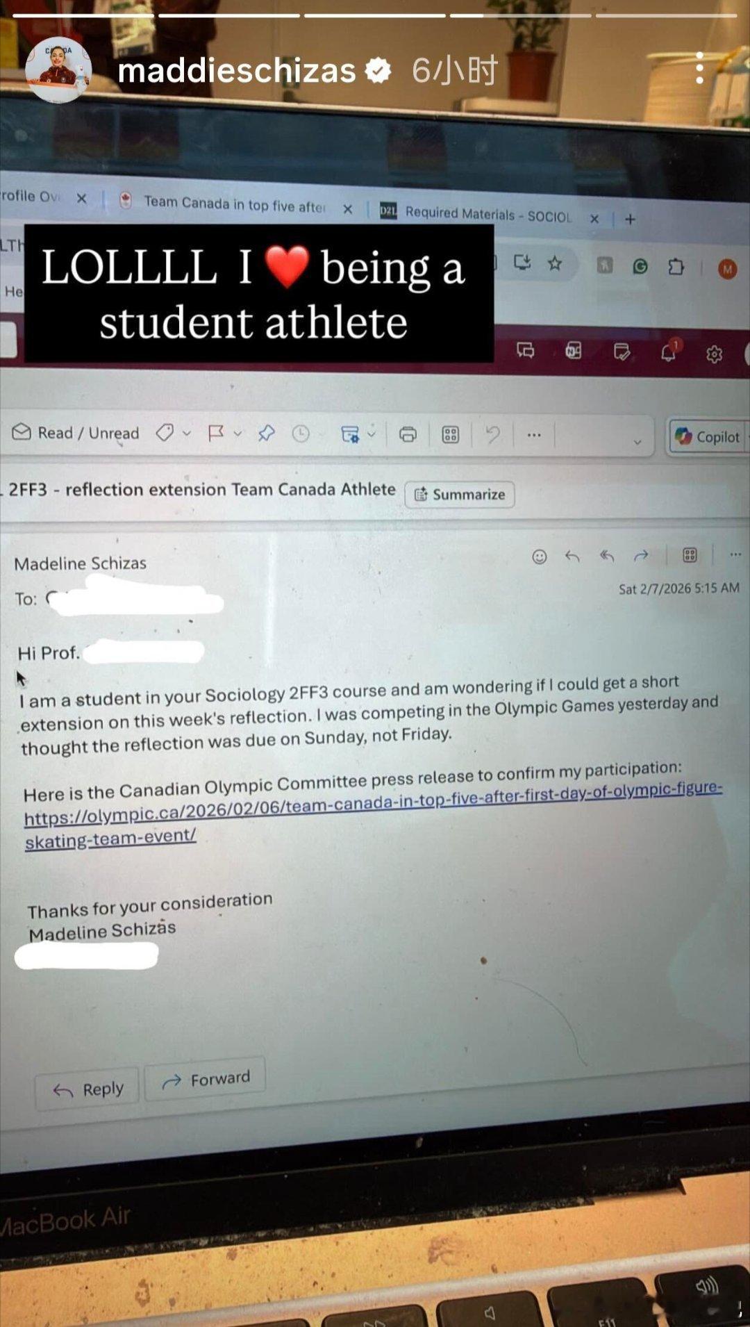 冬奥选手忘交作业给教授打报告Schizas不仅是一位运动员,也是一位麦克马斯特大学(McMaster University)的学生。昨天,她发现自己忘记了作业的ddl,于是紧急给教授写邮件请求通融。你看,就算是奥运会选手也是要写作业的!