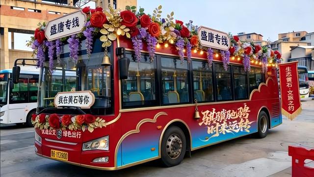 本次活动专属的“盛唐专线”,是黄石市城发集团统筹安排、黄石市文旅集团与黄石市公交集团协同创新的移动盛唐风景线!大巴车内外将全方位还原盛唐美学,鎏金纹饰、鲜花团簇、诗意灯笼点缀其间,踏入车厢仿佛一秒穿越千年,随手一拍都是古风大片。