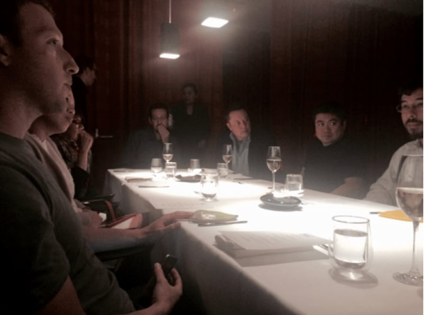 美司法部公开的爱泼斯坦案文件照片显示,扎克伯格(左一)、马斯克(右三)等人共进晚宴。图自美媒