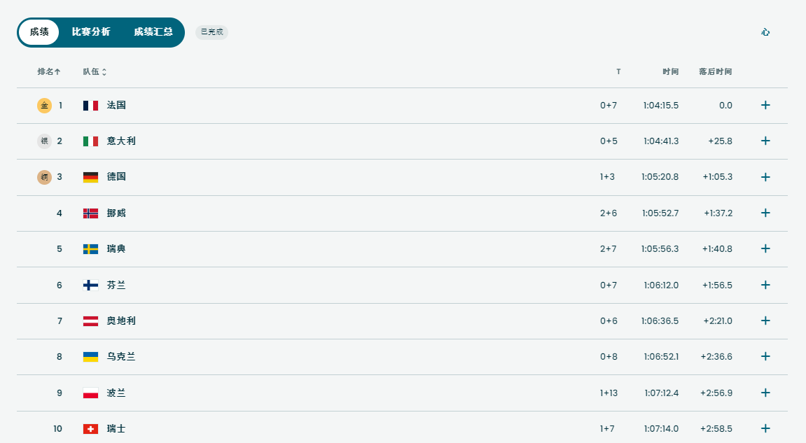 虎扑02月08日讯今晚结束的冬季两项混合接力4X6公里决赛,法国队以1:04:15.5的成绩夺冠。