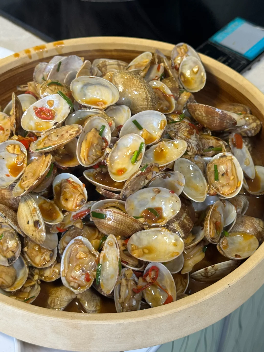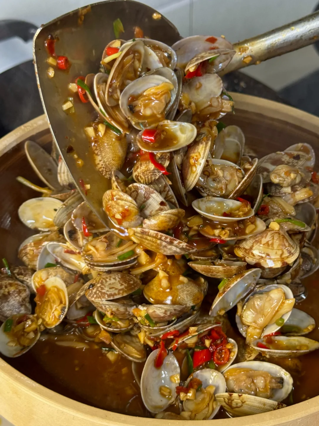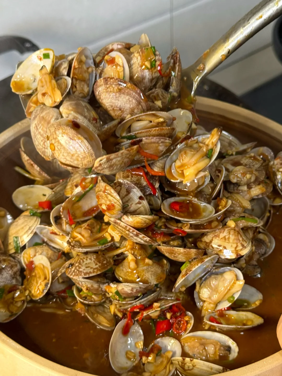 1. 花蛤菜市场买回来以后加入少许盐和油搅拌均匀,泡几个小时,让它把沙子涂干净 2. 喜欢吃辣的多切一点小米辣,然后就是生姜大蒜沫也多一点,少许葱白段 3. 小火爆香生姜大蒜小米辣,葱白段加入一勺薄盐生抽,一勺蚝油,一丢丢糖,一勺豆瓣酱小火炒出红油 4. 过一会儿打开锅盖基本上全部开口了加入适量鸡粉葱花就可以出锅啦 5. 可以用适量水淀粉勾芡哦