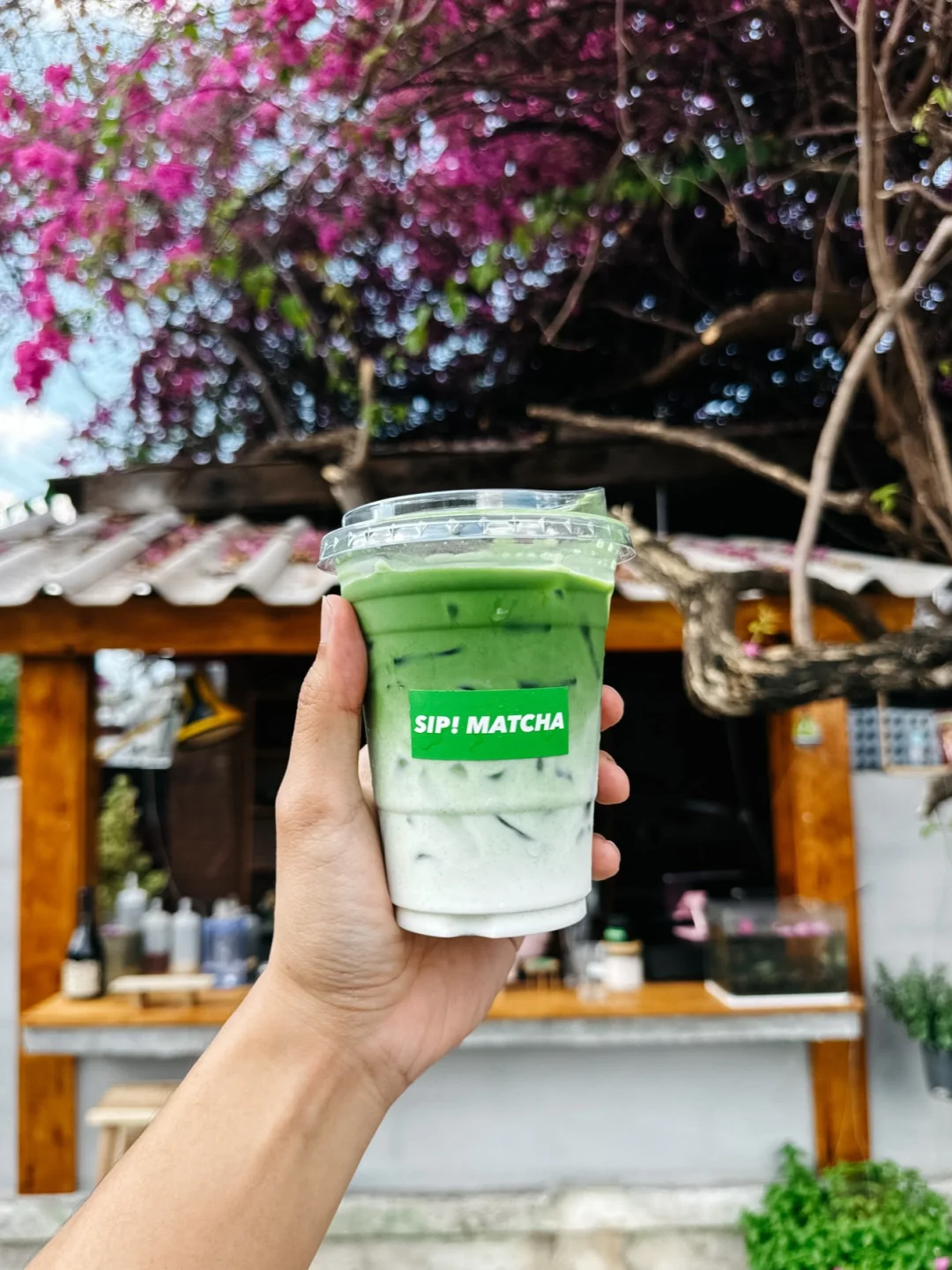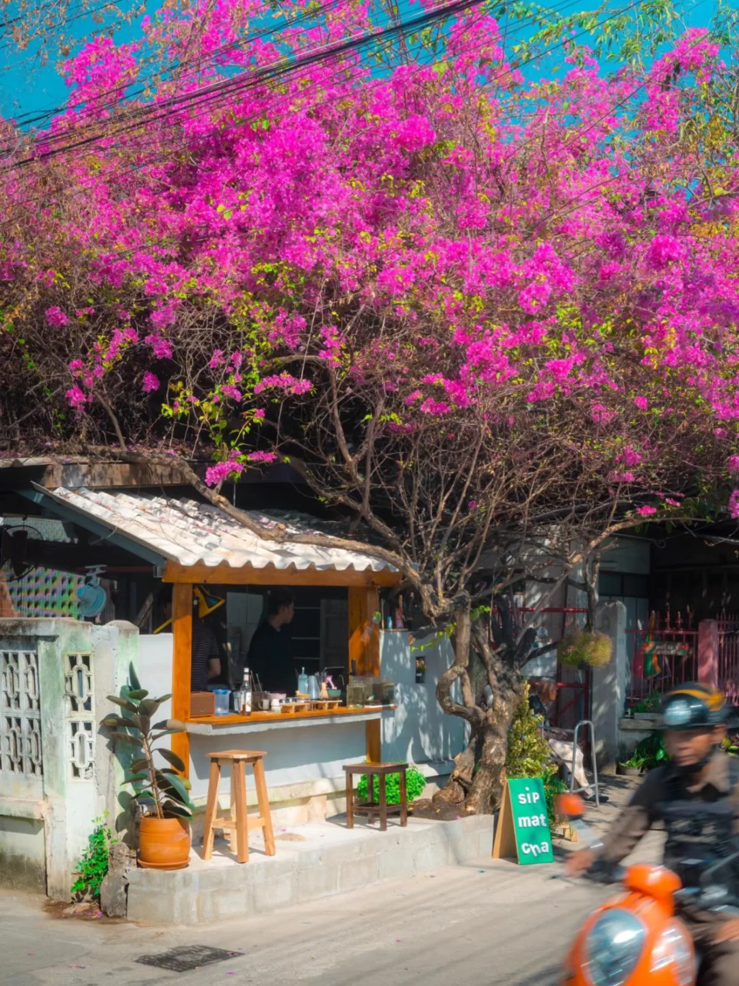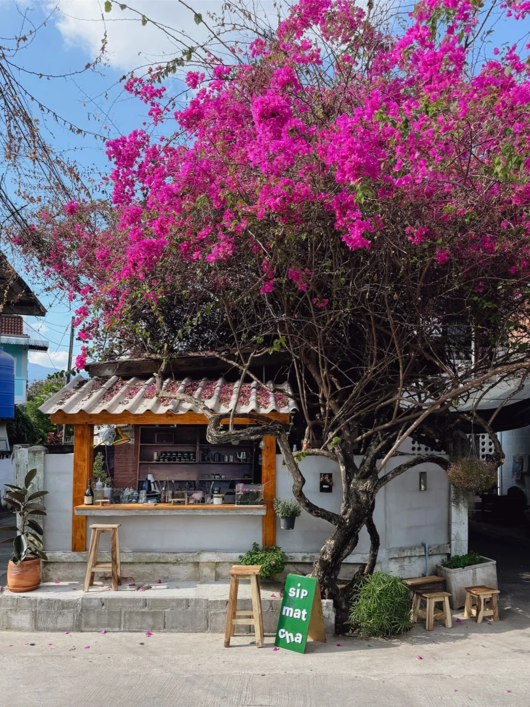 当时看到这家抹茶🍵店的时候,真的惊为天人,位于一颗粉色三角梅树下,当时花开的超级灿烂,真的太美了。点了一杯店里的饮品,也好喝!