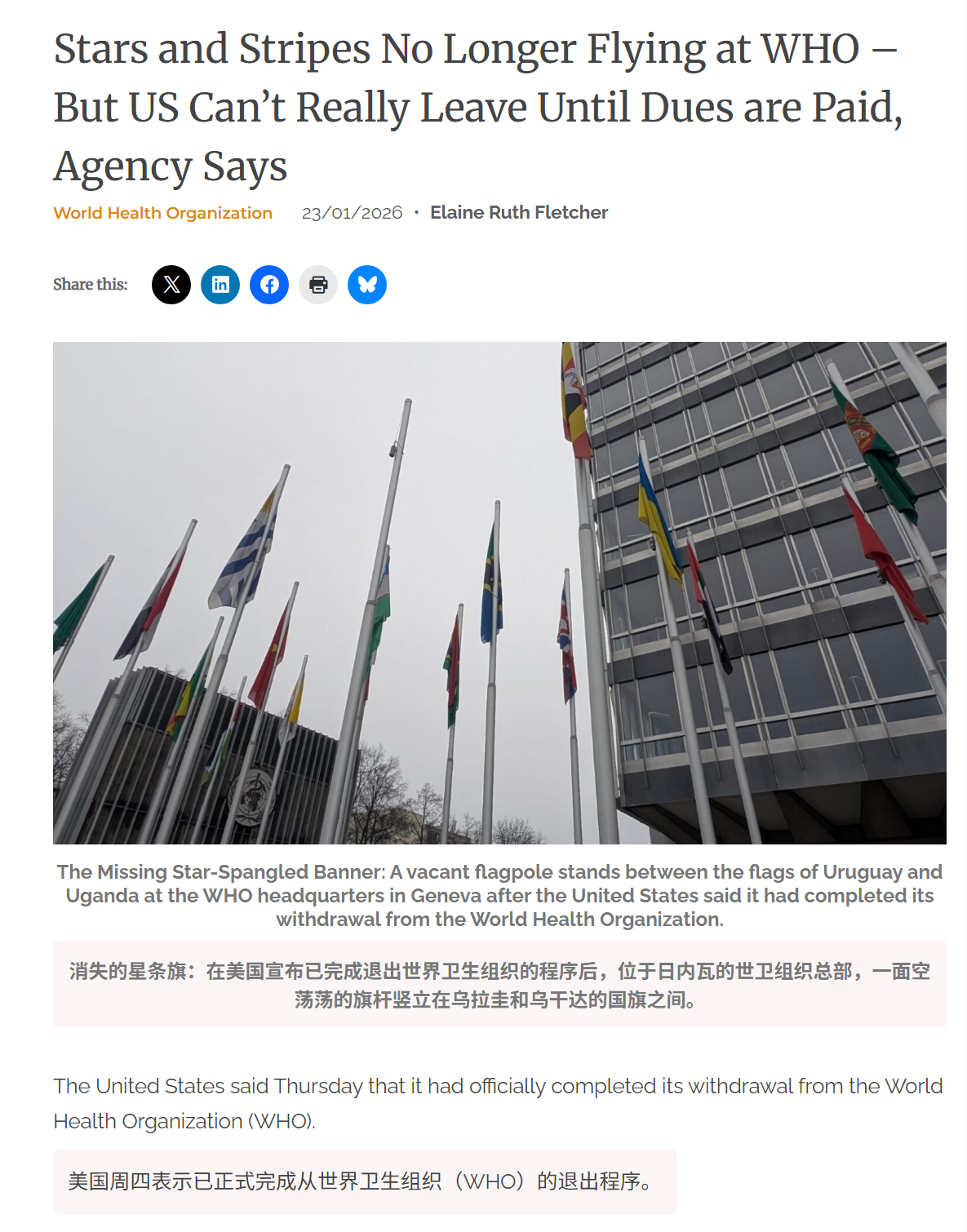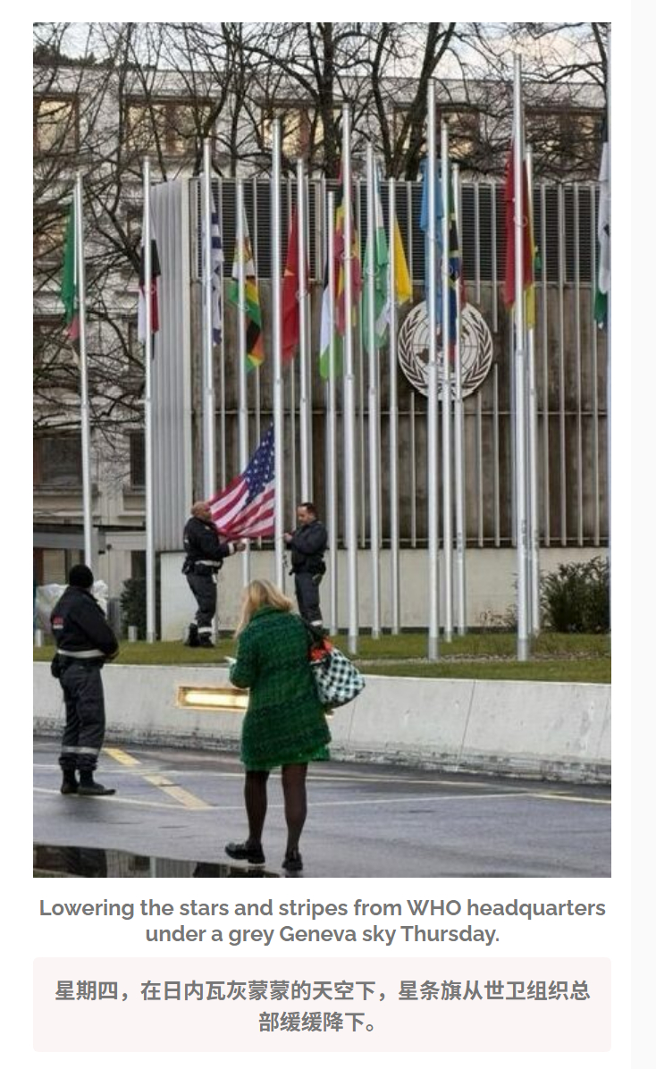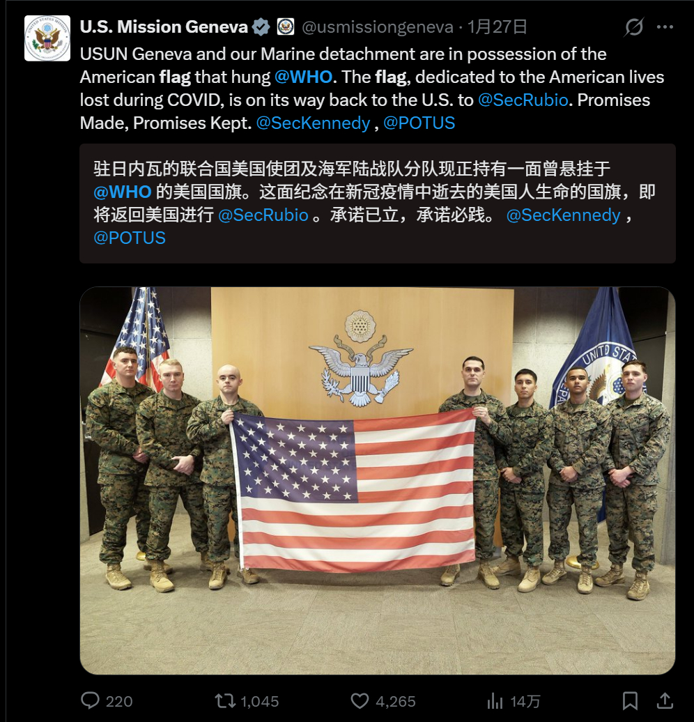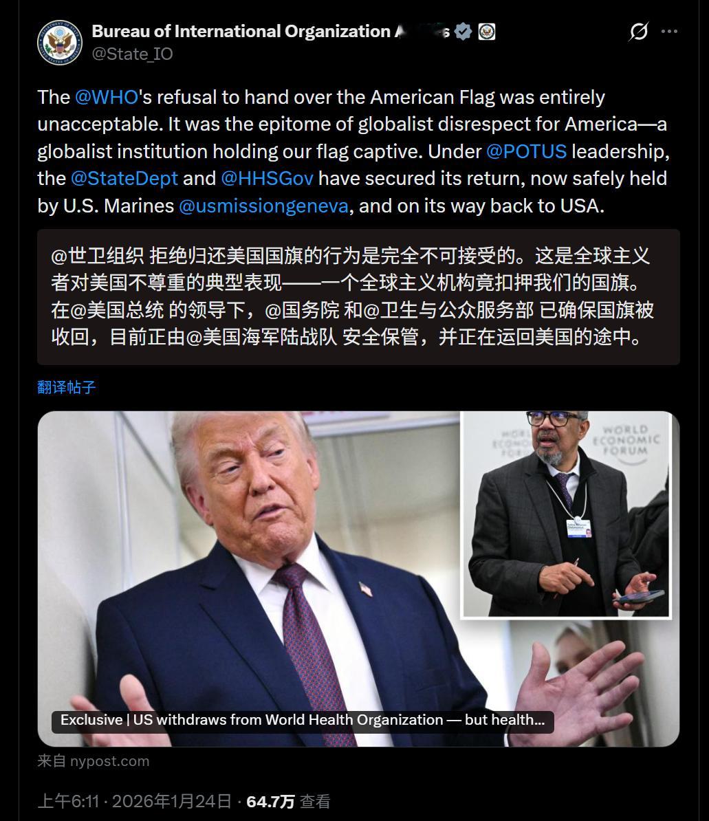 🔻有人目击到:1月22日,WHO 日内瓦总部的美国国旗是被身穿黑色制服的保安降下来的(图1-3),旗杆已经空了。🔻鲁比奥骂骂咧咧在图5。🔻目前尚不知道美国驻日内瓦使团的海军陆战队在哪、怎么抢回的美国国旗(帖子1月24日、27日分两次发的,图6-9)。🔻总不能是给保安两包华子,问保安要的吧?海外新鲜事热点现场