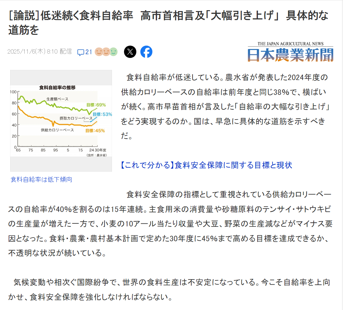 🔻经济政策是此次日本国会选举中选民关注的重点,许多人认为日本由于高税收和通货膨胀导致的生活成本上涨是他们心中最重要的问题。🔻许多日本选民告诉《每日电讯报》,他们认为高市早苗是最适合帮助降低物价的候选人。日本正遭受持续超过 3%的通货膨胀、日元疲软以及食品和能源进口成本上涨的困扰。工资增长未能跟上通胀步伐,大米价格已上涨 60%。🔻“她降低了汽油成本,这表明她会兑现承诺。我全力支持她,”居住在南部城市熊本的 25 岁化妆品销售员广濑虹帆说。🔻然而,高市早苗的重要竞选承诺之一是什么呢?“日本粮食自给率达到100%”。🔻根据农林水产省最新公布数据(2025年10月),2024 年度日本基于热量的粮食自给率仍为 38%(与前几年持平)。日本政府自己设定的2030年目标才45%——目标已经连续多年达不到。🔻米接近100%,蔬菜约77–80% ,但小麦≈14%、大豆≈6–7%、饲料谷物极低意味着日本的肉蛋奶的自给率被严重拉低(其中饲料80%靠进口)。🔻要把整体热量自给率拉到100%,相当于要把小麦、大豆、饲料谷物自给率也大幅提高,这需要日本提供几倍于现在的耕地面积,几乎是物理上不可能的。🔻日本人就跟着老苗子赌国运了。日本执政联盟将获众议院过半议席海外新鲜事热点现场