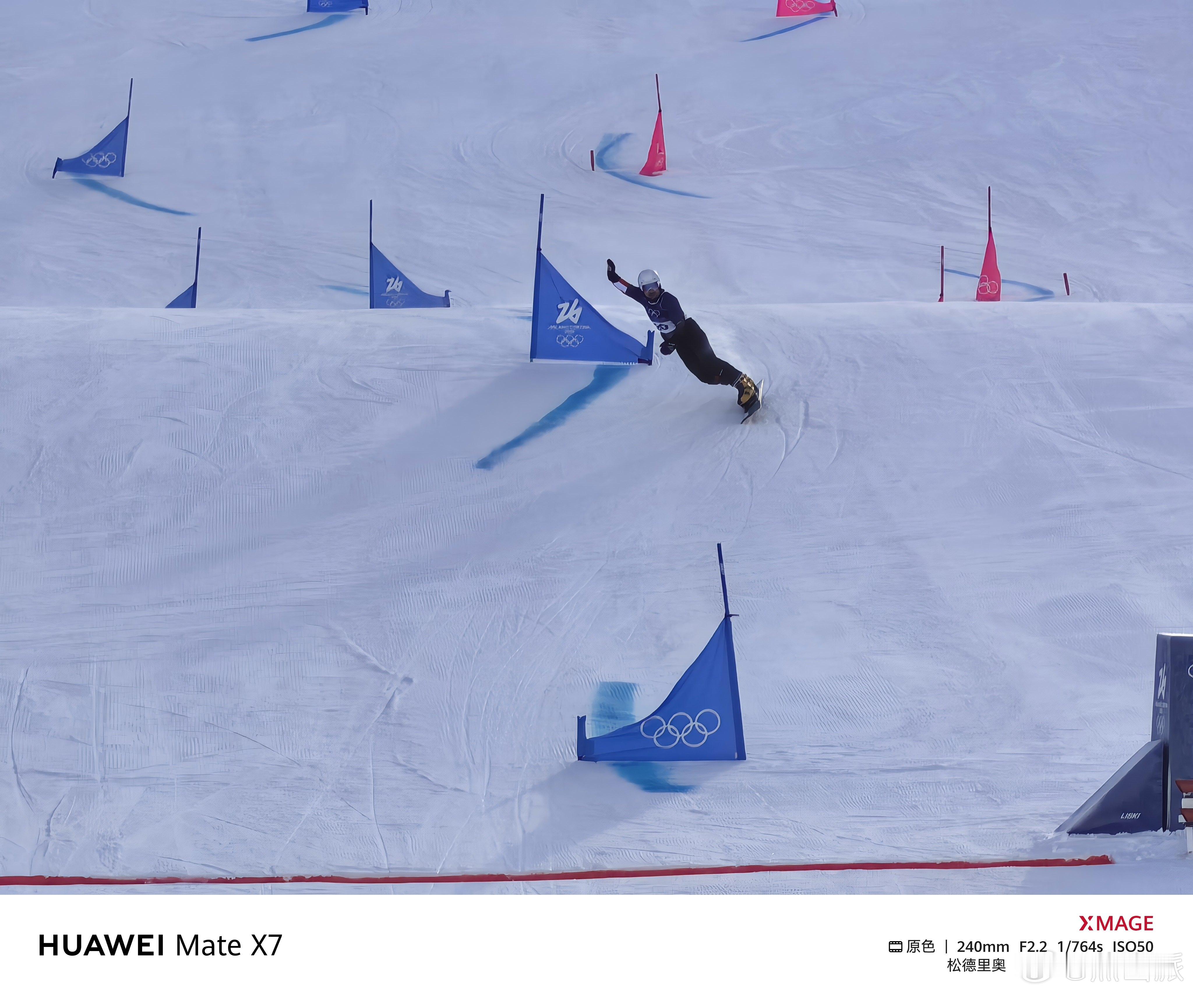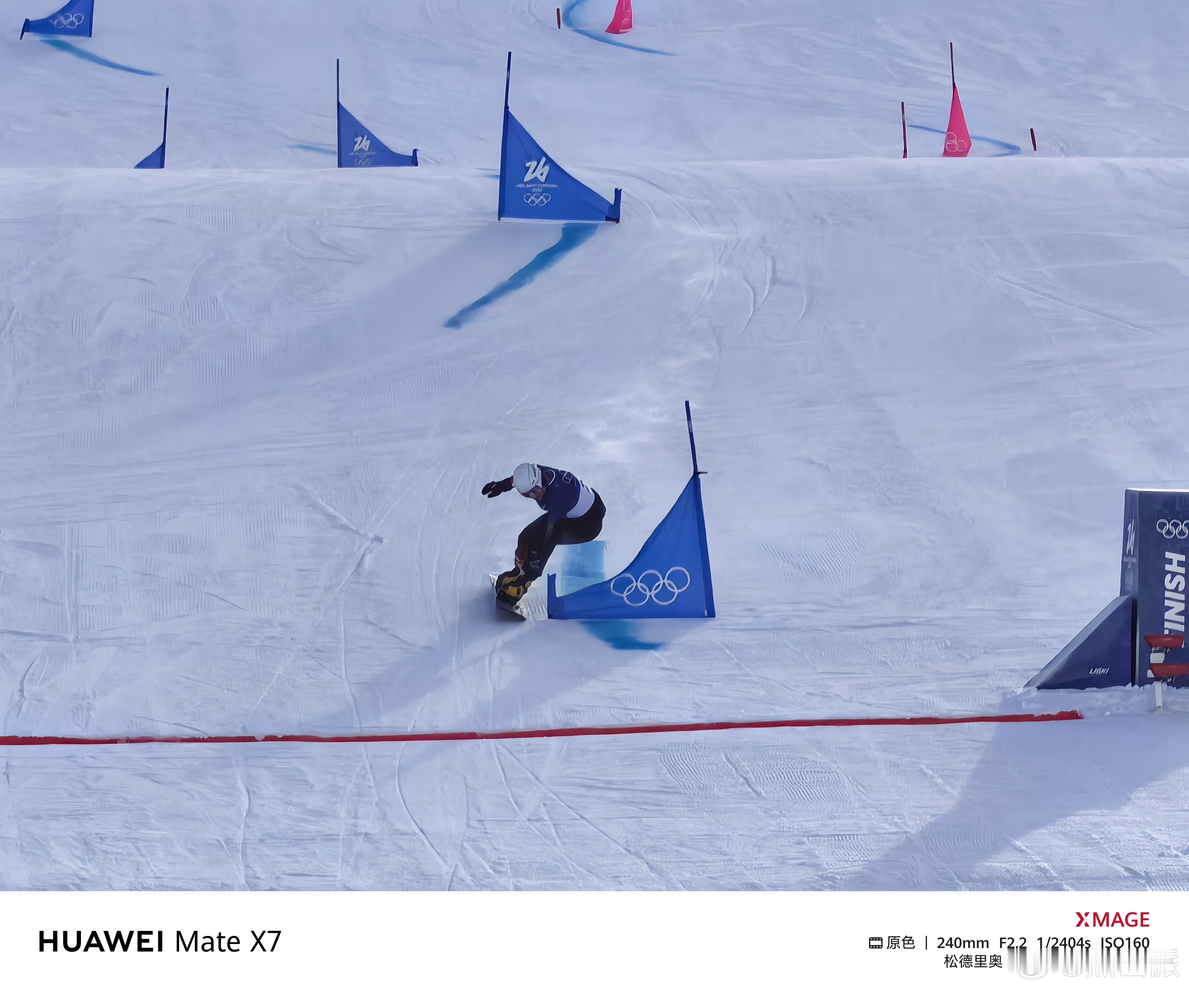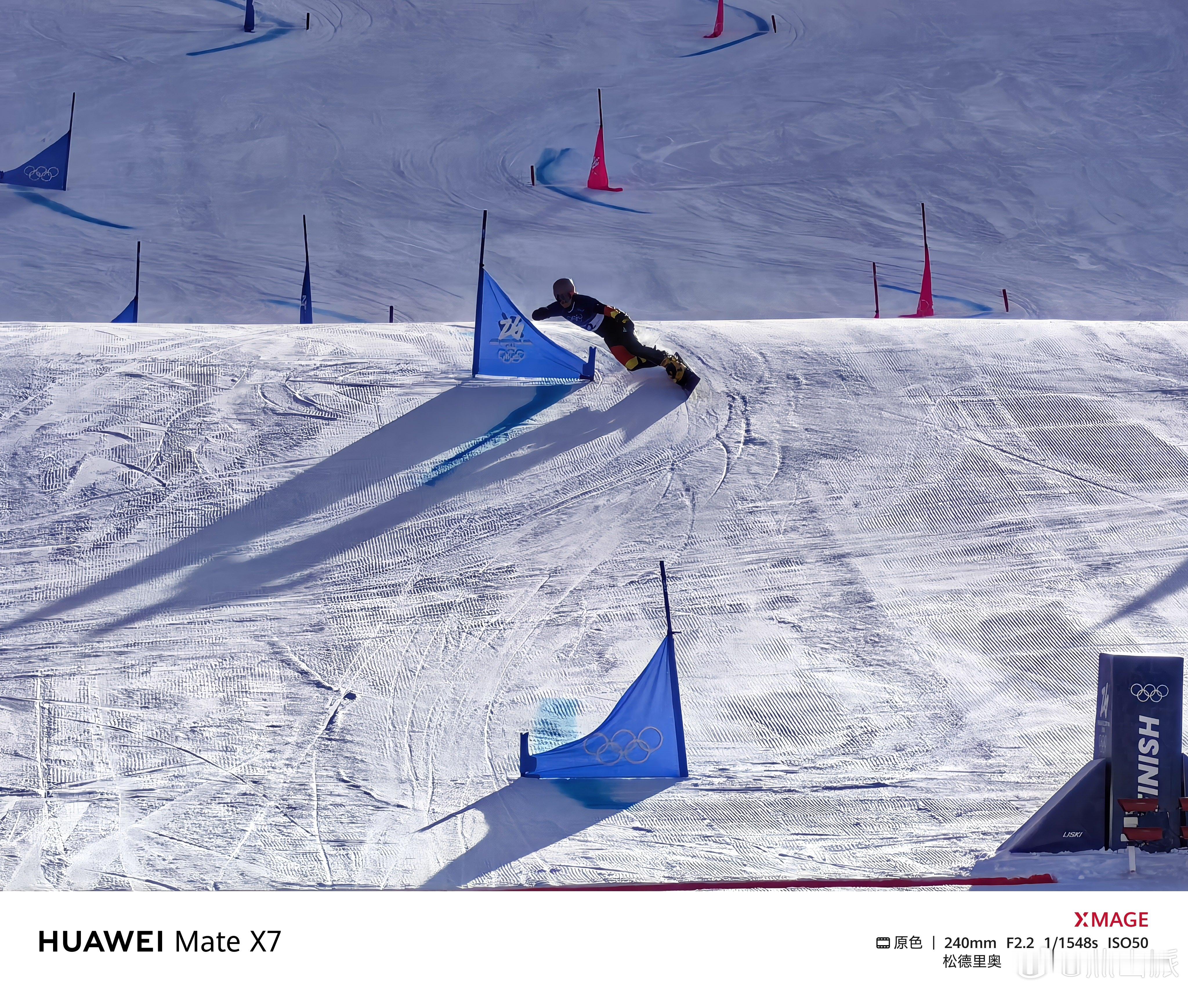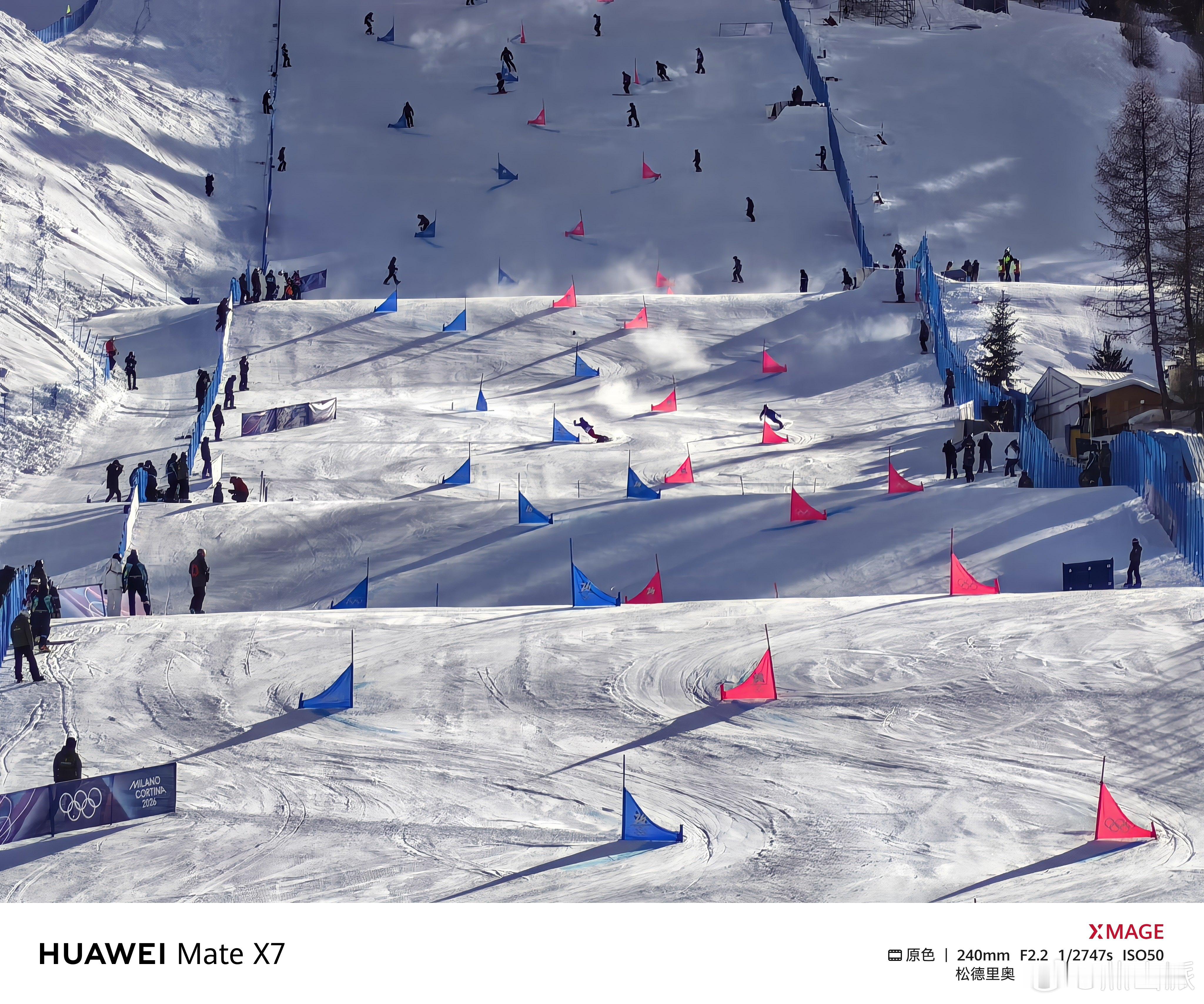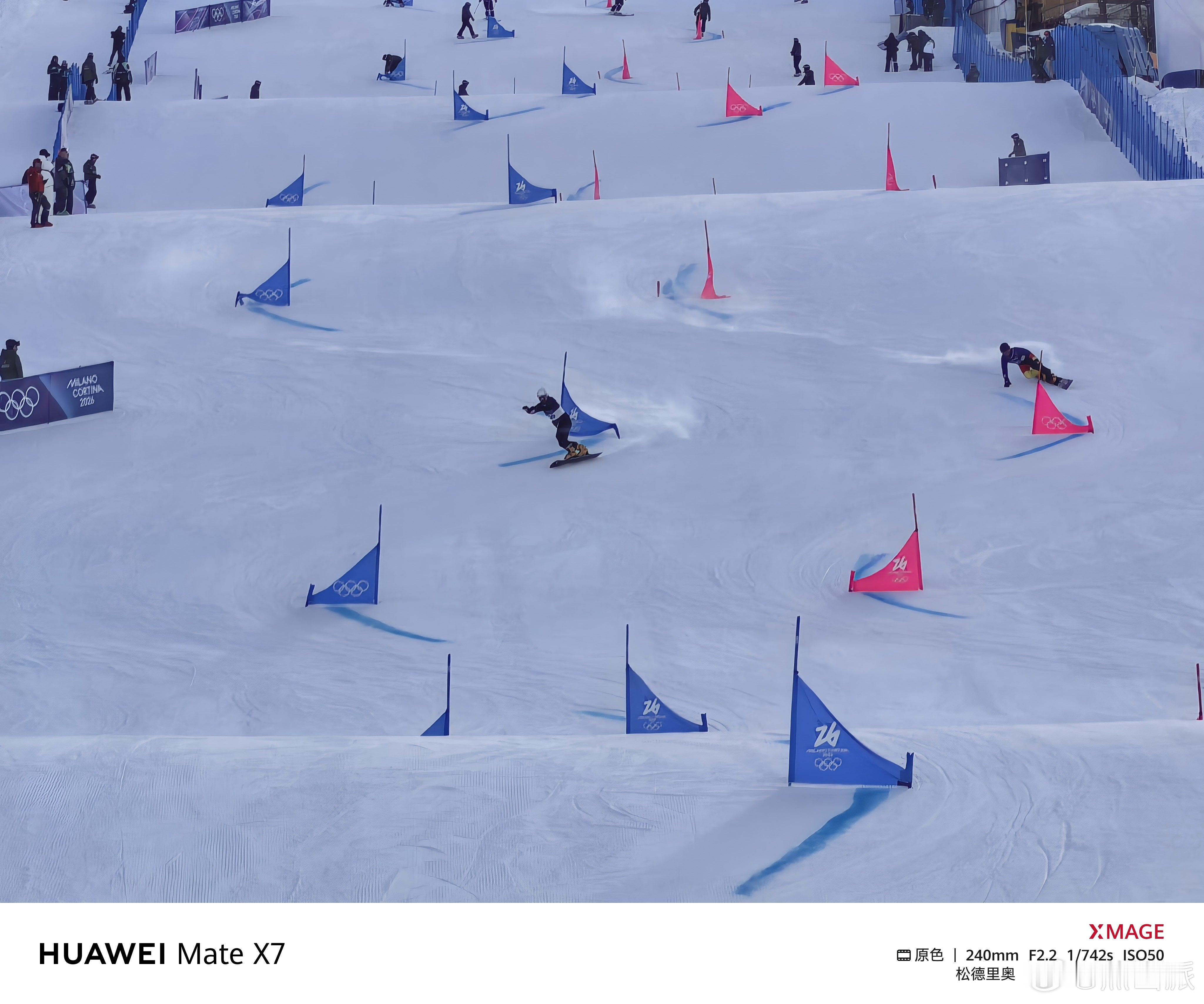 米兰冬奥会 前方小伙伴儿没抢到大跳台决赛的票,只看了单板滑雪男子平行大回转资格赛、单板滑雪女子平行大回转淘汰赛。距离比较远,只能用10倍长焦拍,没想到华为Mate X7也这么稳,不只是这么远距离抓拍也清晰,而且选手从阴影区冲入逆光区这种光线快速变换的情况,华为Mate X7相机反应也足够及时,太稳了!。冬奥加油