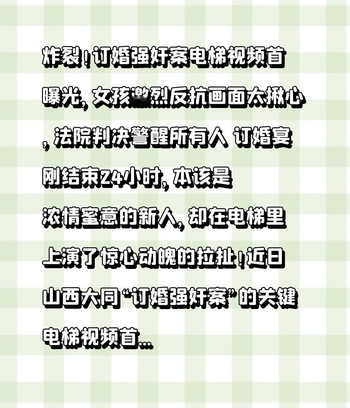 炸裂!订婚强奸案电梯视频首曝光,女孩激烈反抗画面太揪心,法院判决警醒所有人 订婚宴刚结束24小时,本该是浓情蜜意的新人,却在电梯里上演了惊心动魄的拉扯!近日山西大同“订婚强奸案”的关键电梯视频首次曝光,画面里女孩拼命挣脱的模样让无数网友揪心,而这起横跨3年的案件,终于用法律给出了最硬核的答案:订婚≠默许,自愿才是底线! 2023年5月1日,山西大同的席某和吴某按当地习俗办了热热闹闹的订婚宴,男方送上10万彩礼和金戒指,还承诺婚后房产证加女方名字,所有人都以为这是幸福的开始。可谁也没想到,第二天下午,席某以看婚房为由,将吴某约到新房,提出发生性关系被拒后,竟然不顾反抗强行施暴。 直到央视曝光的电梯监控流出,大家才看清事发后的真相:视频里席某死死拽着吴某的手臂,指节用力到发白,而吴某身体后仰、拼命挣扎,脸上满是无助与恐惧,肢体的激烈拉扯隔着屏幕都能感受到她的绝望。更让人愤怒的是,事后吴某情绪崩溃到点火烧窗帘、跑到楼道喊“救命”,还被席某强行拖回房间,手机也被夺走,直到母亲打电话才得以归还,当晚她就鼓起勇气报了警。 可案件审理却一波三折。席某当庭否认强奸,其父母更是坚称“儿子无罪”,还拿出“女方处女膜完整”“未检出精斑”的鉴定报告辩解,甚至有网友被误导,质疑女方“骗婚敲诈”。但法院逐一核实证据:床单上的混合DNA、吴某身上的多处淤青、被扯坏的窗帘,再加上电梯视频和席某曾默认“强暴事实”的录音,形成了完整的证据链,清晰证明行为违背女方意志。 2025年4月,二审法院最终维持原判,判处席某有期徒刑三年。法官的判决掷地有声:“订婚只是民间约定,不能成为剥夺他人自主权的理由,婚恋的核心永远是自愿且明确的合意”。更解气的是,席某家起诉要求返还彩礼,也因女方早已退还、男方拒不领取而被驳回。 这起案件之所以引发全网关注,不仅因为它打破了“订婚后就该顺从”的老旧观念,更给所有人上了一堂法治课:无论是恋爱、订婚还是结婚,任何亲密关系都不能凌驾于“自愿”之上。女性的身体自主权,从来不该被婚约、习俗所绑架。 电梯里女孩的反抗,是对暴力的拒绝,更是对权利的捍卫。法律的判决,不仅还了被害人一个公道,更划定了不可触碰的红线。如果你认同“爱不是强迫,尊重才是底线”,就点赞转发,让更多人看到这份法治正义,也提醒每一个人:婚姻的前提是尊重,任何违背意愿的强迫,都终将受到法律的严惩!