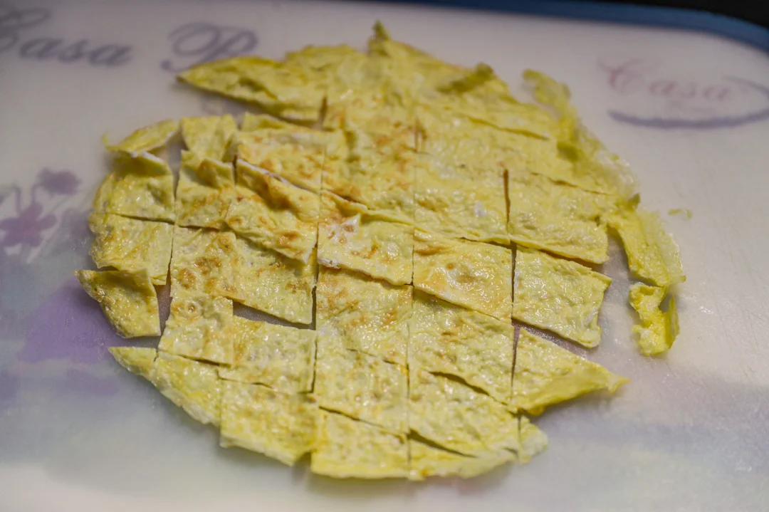 ✨2.鸡蛋打入碗中,搅散,倒入油锅中摊成鸡蛋皮,放到案板上,切成菱形片。