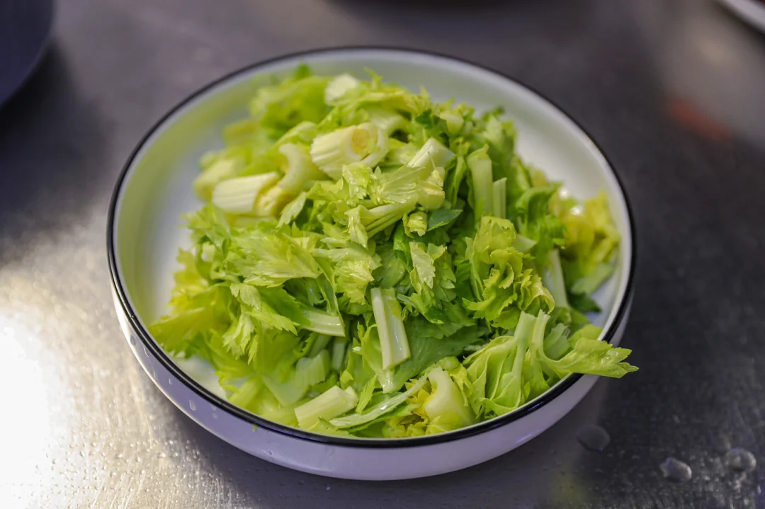 ✨3.芹菜叶放入热水中汆烫一下,捞出放入凉水中,控干水分。