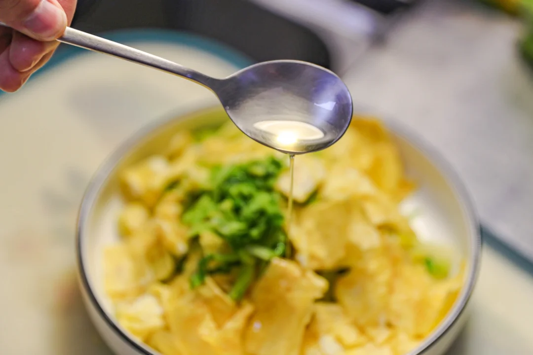 ✨4.把芹菜叶和鸡蛋皮放入容器中,加入蒜末,姜末,生抽,醋,芝麻香油和辣椒油,调拌均匀即可。