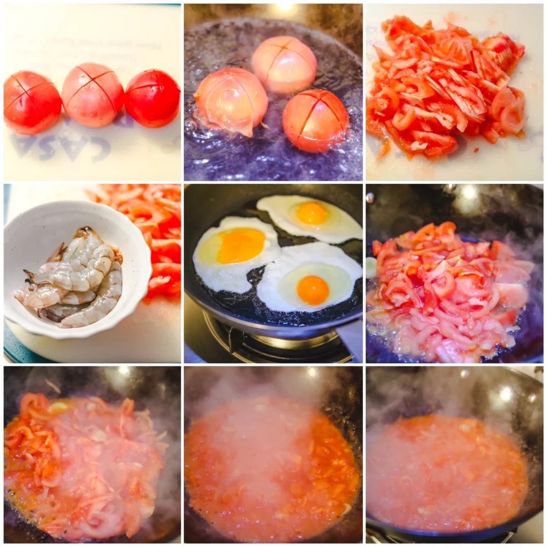 2.去完皮的西红柿切成薄片,葱切成葱花,姜切成米粒,海虾去壳,去虾线。
