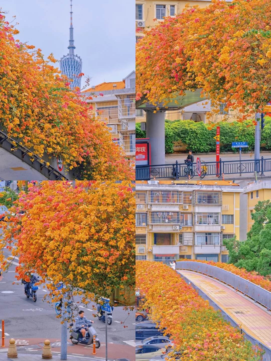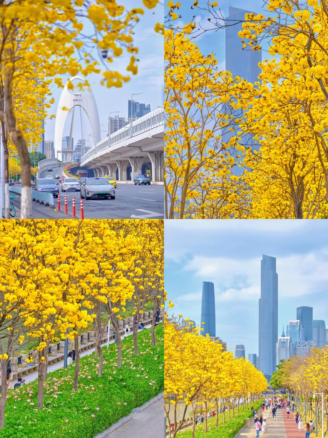 满树金黄缀满枝头,没有一片杂叶,纯粹又热烈,这里能拍到黄花风铃木与广州塔同框的神仙画面