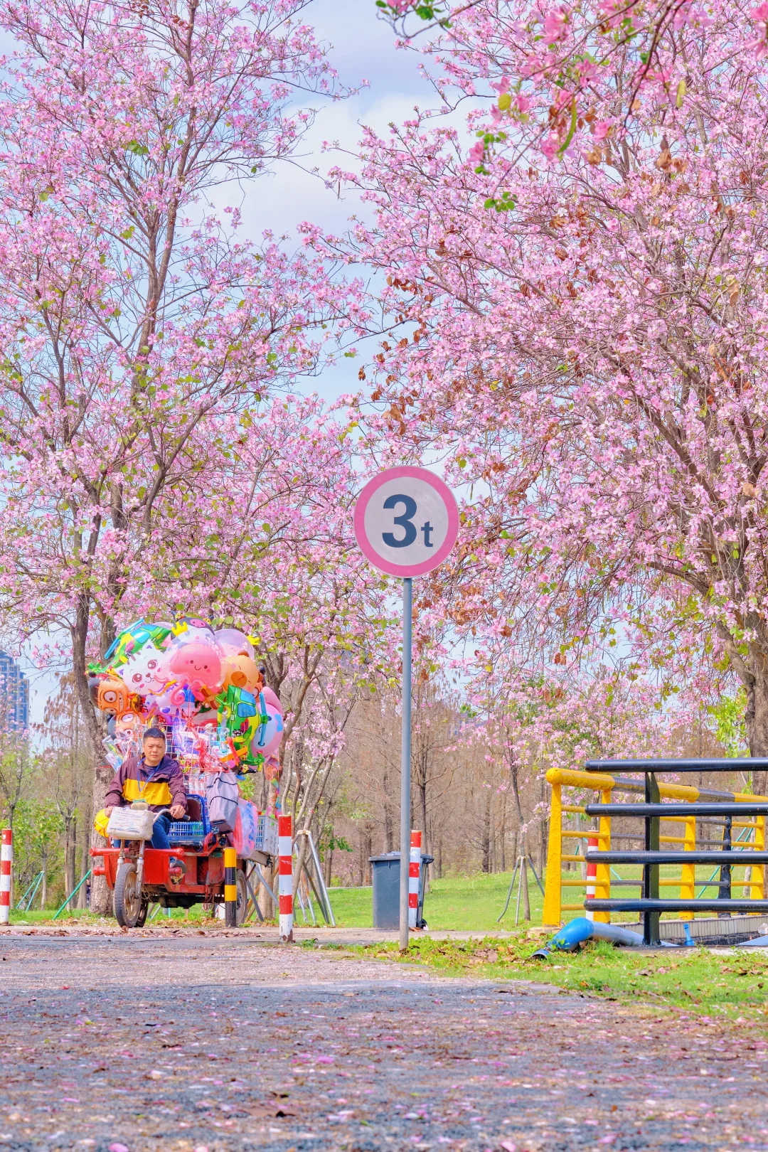 大学城的道路旁,紫荆花在肆意绽放,粉白、淡紫的花瓣缀满枝头,形成一条长长的粉色花廊,走在花廊里,仿佛闯入了日系漫画里的场景