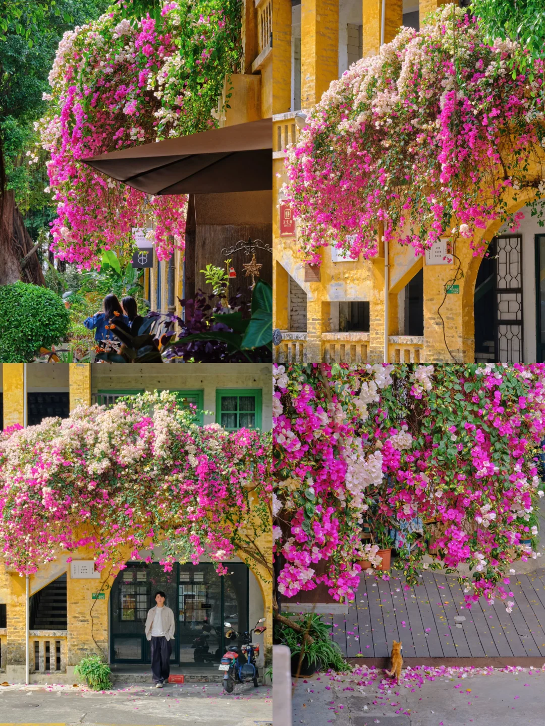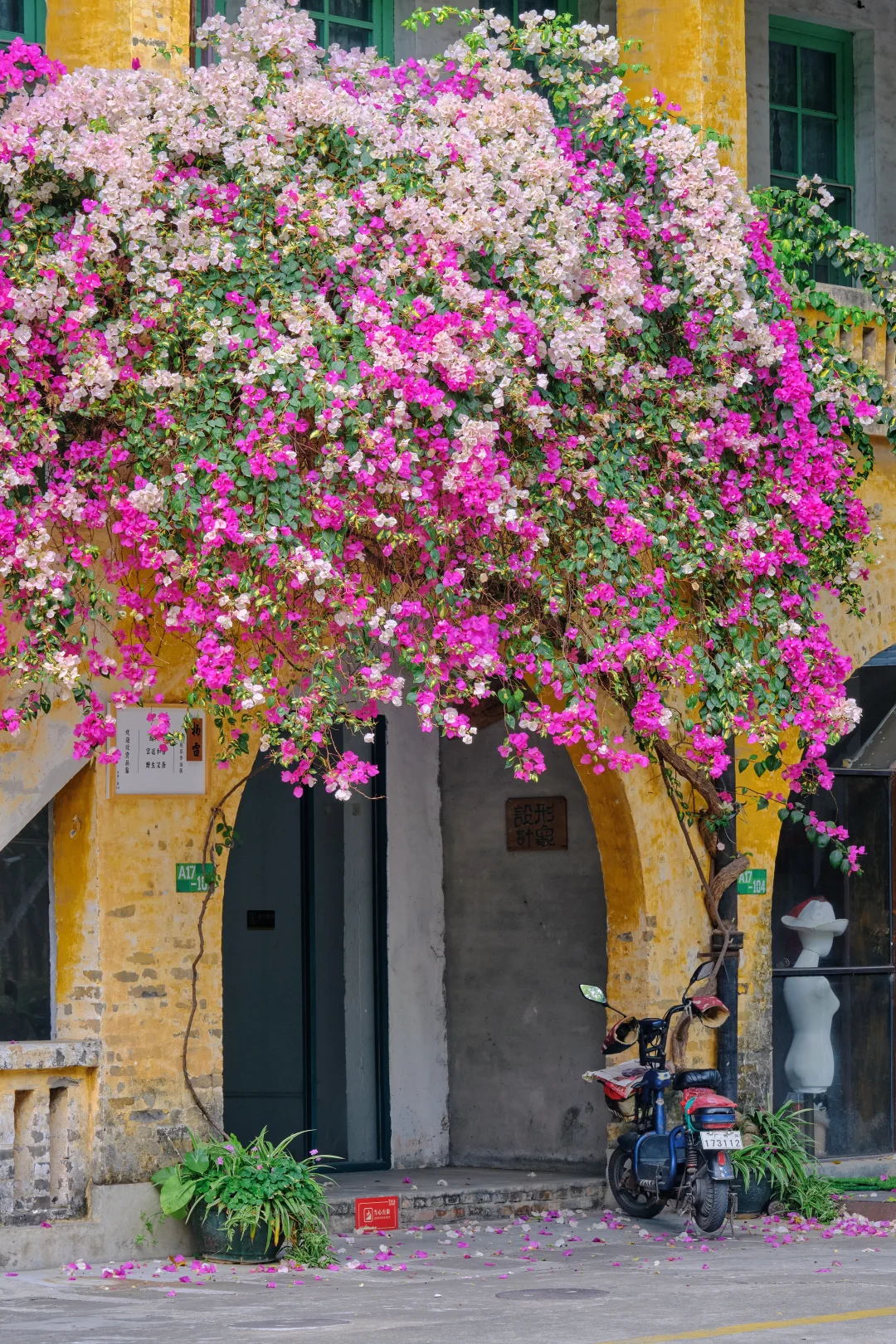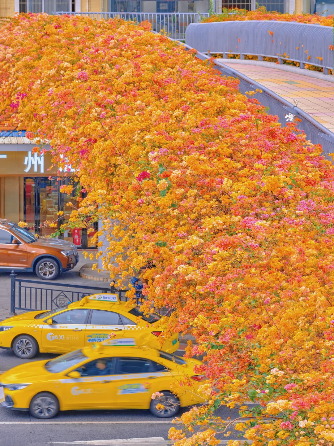 三角梅瀑布从天桥墙头倾泻而下简直美到犯规,一座天桥而已,至于这么美吗?