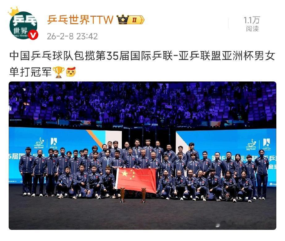 国乒官方社媒晒出今日海口亚洲杯国乒团队大合照! 中国乒协王励勤与国乒总教练秦志戬站在队伍中央,王皓马琳教练分别带领男女队站在两侧。 男队王楚钦林诗栋周启豪,女队孙颖莎王曼昱蒯曼分别站在教练旁边主位。 恭喜国乒包揽本届亚洲杯男女单打冠军! 并且王楚钦孙颖莎王曼昱蒯曼四人获得澳门世界杯参赛资格!