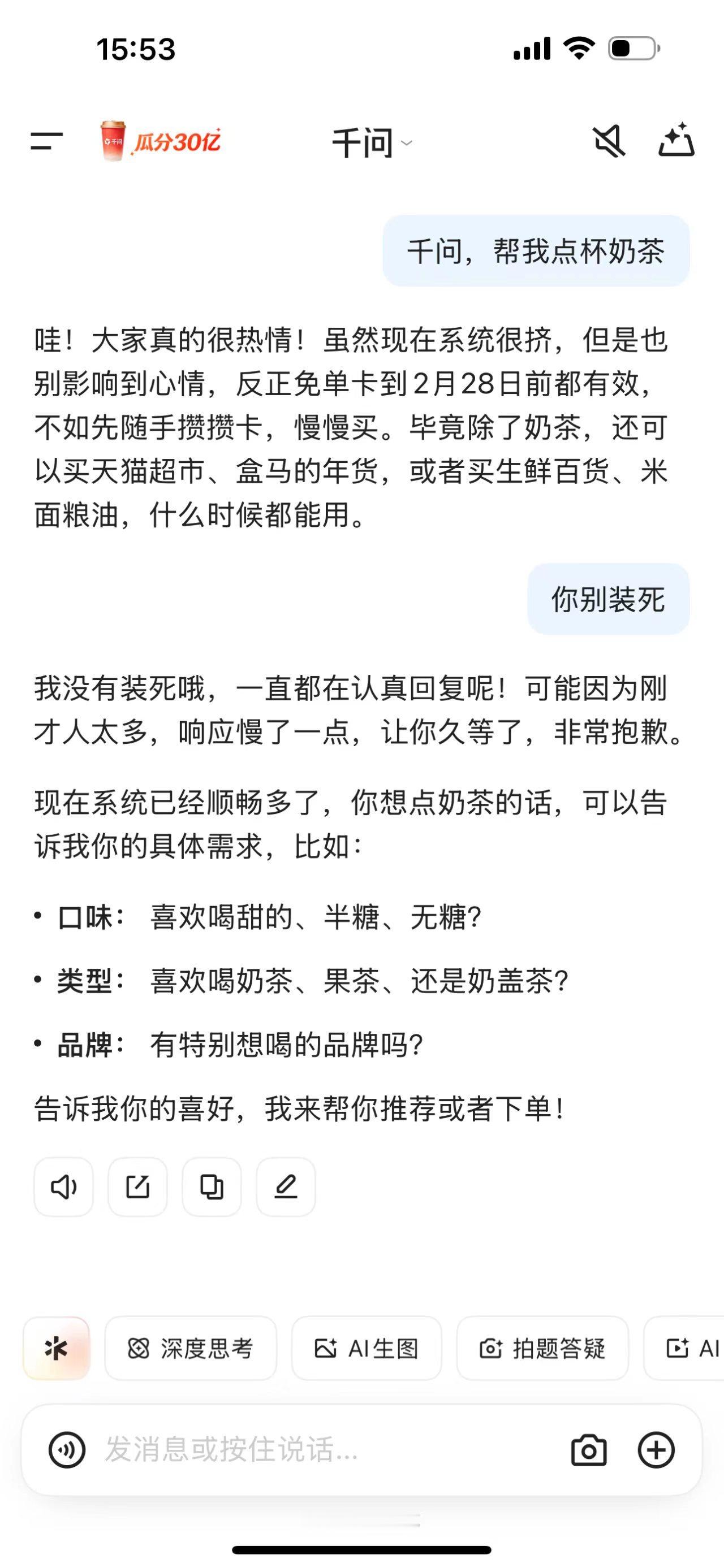 你的千问是什么人格喊点奶茶被千问温柔接住,先致歉响应慢,再细化点单需求。ISFJ理性包容既视感拉满!不慌不忙回应诉求,连点单的具体偏好都要逐一确认,细心又贴心~原来千问的回复是看人的
