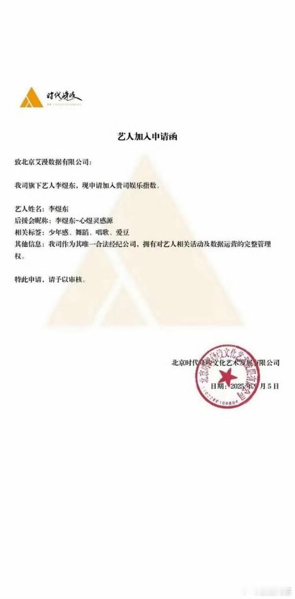 有粉丝扒出来时代峰峻给李煜东申请加入了艾漫数据库,感觉这个数据是内娱影视圈艺人做