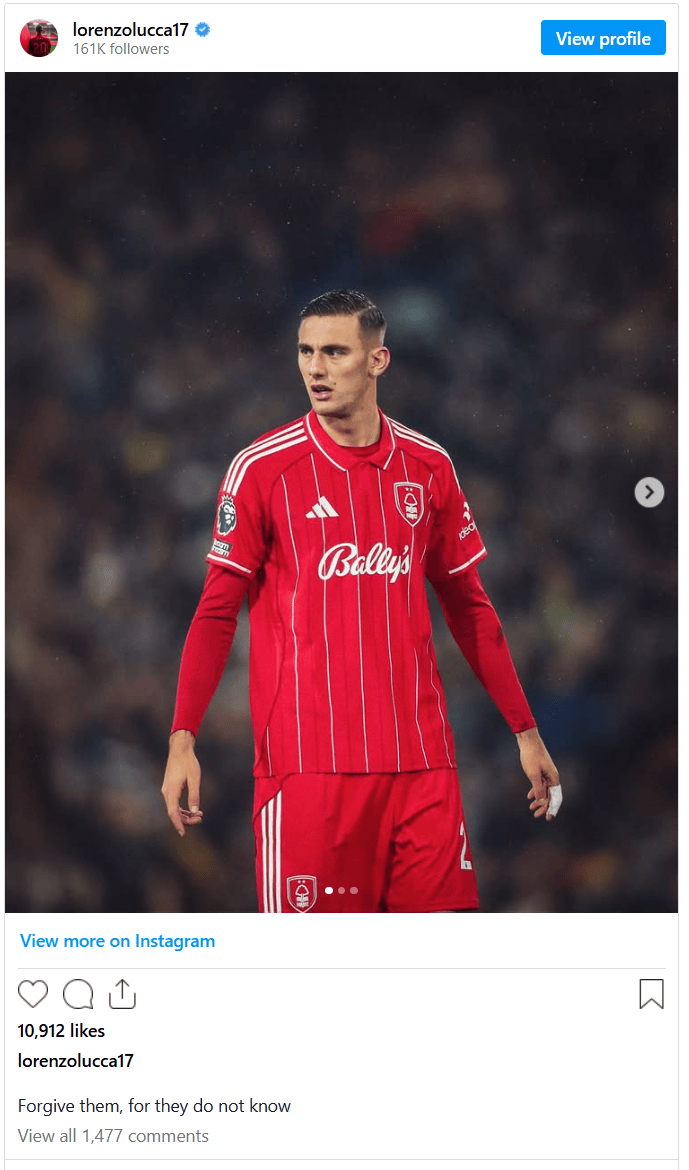虎扑02月09日讯英超第25轮,诺丁汉森林队客场1-3不低利兹联,租借加盟诺丁汉森林的洛伦佐-卢卡在86分钟为球队打入挽回颜面的一粒进球。在为新球队打入首粒进球后,卢卡似乎通过一条Instagram动态向老东家那不勒斯发出挑衅,此举引发了那不勒斯球迷的狂怒和谩骂。