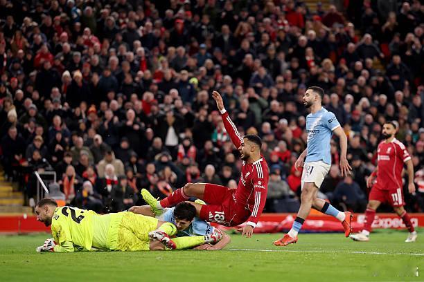 利物浦vs曼城 胡桑诺夫是在用生命在防守。乌兹别克斯坦小伙子硬啊,被自己门将多纳鲁马膝盖顶了一下头部,背后又有哈克波的冲撞。队医紧急救治之后,胡桑诺夫还想坚持。瓜迪奥拉为了保护年轻人,立刻把他换下,换上了迪亚斯。同时切尔基也换下了马尔穆什。