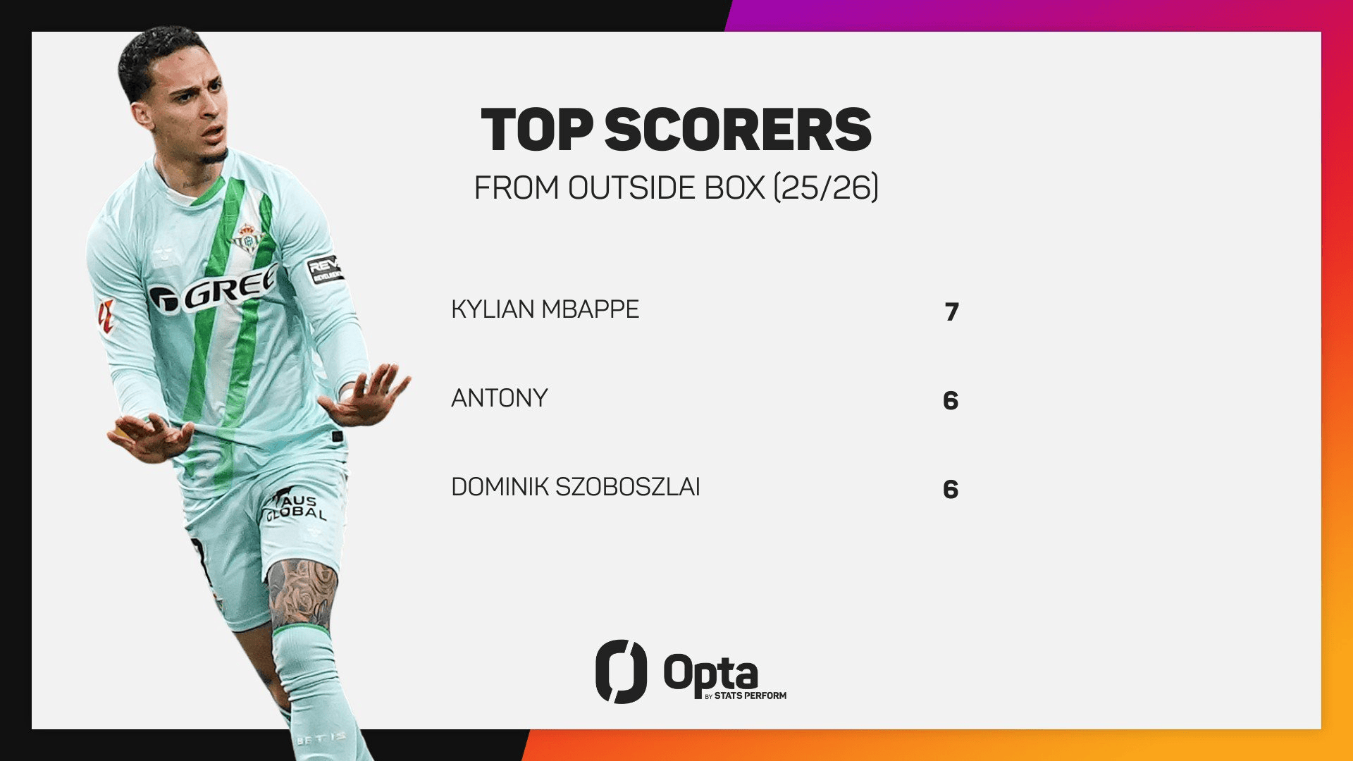 根据数据网站Opta的统计,本赛季五大联赛里只有姆巴佩(7次)各项赛事禁区外起脚射门收获进球的次数比安东尼更多,索博斯洛伊则与安东尼持平(都是6次)。