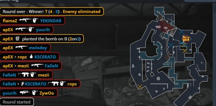 第4回合A大yuurih先杀Zywoo,教父工地同时杀掉mezii与ropz,apex冲进工地爆轰三杀后下包,再杀yuurih完成单局四杀,小蜜蜂4-0黑豹。