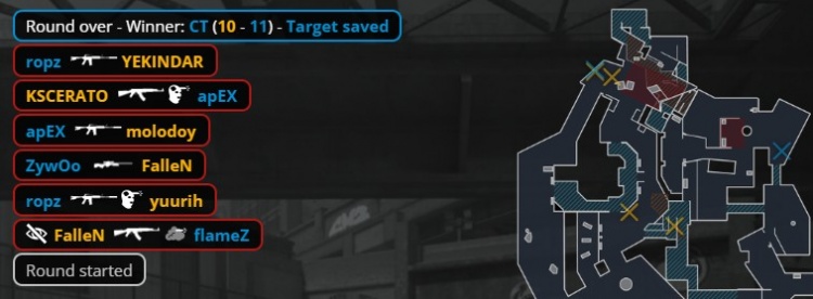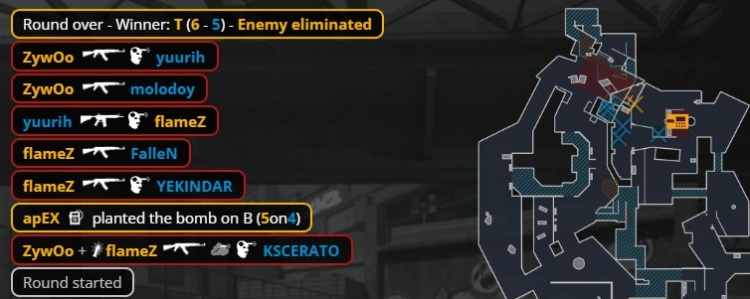 第9回合molodoy厕所大狙先杀游乐园滑梯apex,小蜜蜂四人转A,molodoy空枪被火仔击杀,狂哥与yuurih包点双人三杀,ropz打掉狂哥后保枪,小蜜蜂5-4黑豹。