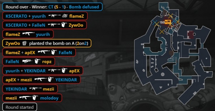 第6回合mezii前顶A大打掉molodoy,狂哥下水道上A打掉mezii,apex包点换掉狂哥,教父法玛斯打掉ropz,火仔再杀教父后下包再杀yuurih,卡神回防双杀火仔与Zywoo后拆包,小蜜蜂5-1黑豹。