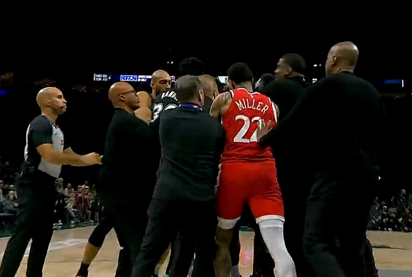 比赛的第四节,邓恩与兰德尔边线球发球争抢,发生激烈冲突。