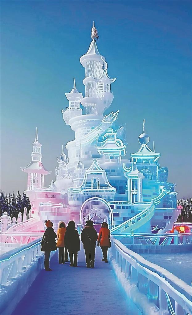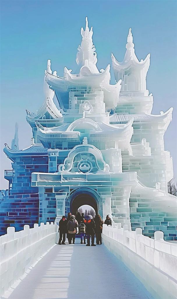 在园区入口不远处,我站在“哈尔滨第二十七届冰雪大世界”13个红色大字前,一种自豪感油然而生。一至二十六届冰雪大世界,我曾经先后游览过三届。而第二十七届却与前几届有所不同,除雪花摩天轮、大滑梯外,很多作品都是新面孔。从精美的花卉、动物造型,到宏大的建筑群落,每一件作品都展现出设计师的巧思妙想、冰雕师的精湛技艺。如“冰瀑玫瑰”“冰扇藏花”等打卡点,福建的土楼、武汉的黄鹤楼、大国重器福建舰和蛟龙号、主宾国比利时的文化元素,以及中华巴洛克、阳明滩大桥等本土文化景观,皆以冰雪为载体,让人感怀冰雪世界的神奇与魅力。