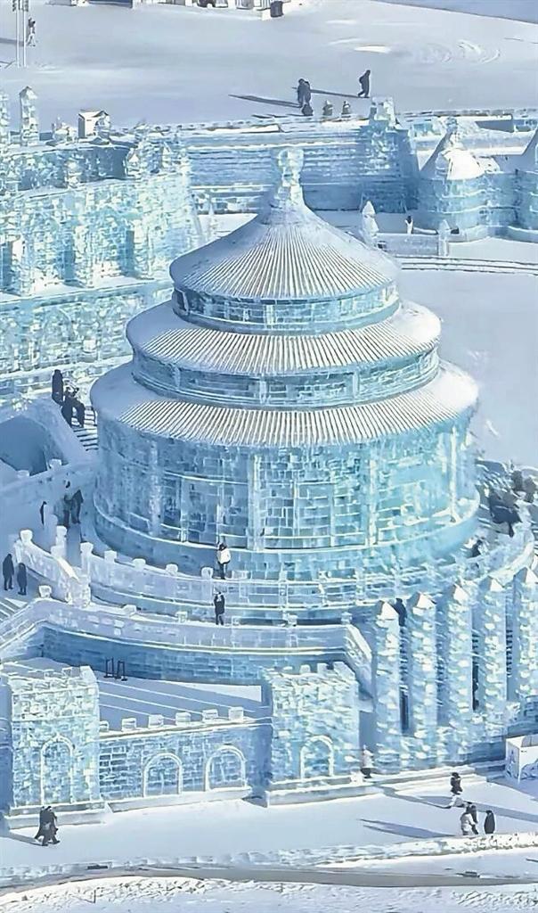 我们是14时进入园区的,观看到了冰雕的晶莹剔透,而待到16时灯光亮了,这是夜与昼的分界线,我们将视觉转换到观赏夜景。虽然时间只是短短的几个小时,却穿越了夜与昼的两个世界。游览冰雪大世界,最让我流连忘返的是冰雕景观。每到一处,我的脚步就像被冻在地面上不能挪动一样,一站就是很久,也许是与我从事建筑专业有关,同行的老友俊清调侃我:“要不你就从土木工程师转为冰雕建筑师吧。”