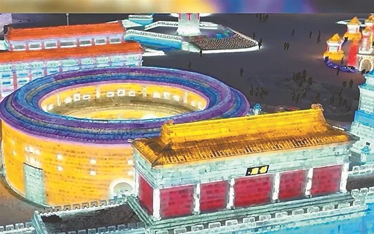 在园区的冰雪景观中,我们不断地更换景点。于白天的时间段里,我围着福建土楼的环形结构转了一圈,冰雕在阳光下折射出晶莹剔透的光芒,如同水晶宫殿般闪耀;在夜晚的时间段里,我又绕着土楼的四周仔细地观看了几遍,在智能LED灯光的精准投射之下,冰雕被五彩斑斓的光影笼罩其中,不仅增强了建筑的立体感和层次感,还被赋予艺术生命的美感,营造出如梦如幻的热烈氛围,仿佛大自然的冰雪之美,蓦然间凝固于土楼建筑之上。