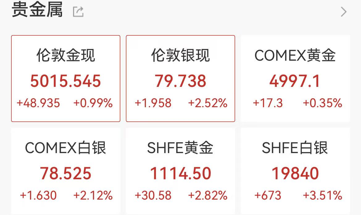 2月9日,现货黄金、白银表现出反弹态势。现货黄金逼近5000美元/盎司;现货白银日内一度涨超2%。