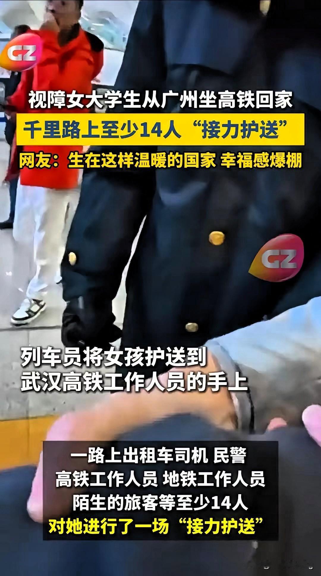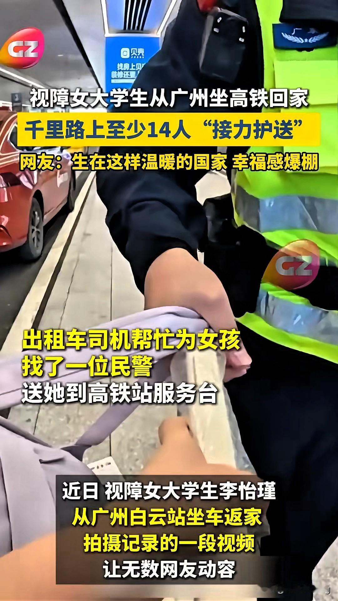 看哭了!双目失明女大学生独自跨省回家,14位陌生人接力守护,全程零磕碰平安到家,这才是过年最暖的光! 李怡瑾看不见世界,却被世界温柔包围。从广东到武汉,她本忐忑不安,可一路全是暖心相助:司机稳行、工作人员全程陪护、列车员贴心照顾、路人主动伸手。14份善意,织成一张安全网,把黑暗照得透亮。 真正的善良从不是惊天动地,而是默默搭把手、耐心陪一程。她眼里无光,心里却装满了温暖与光亮。 这一路的温柔,有没有戳中你的心?你在路上遇过哪些暖心小事?