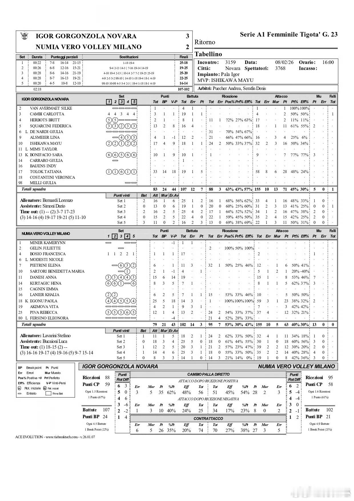 米兰艾格努25分(59扣23中3失误1被拦2拦)达内西15分(15扣8中1失误7拦)皮瓦12分(37扣12中4失误,24一传)小库8分(8扣5中1失误1被拦3拦)拉尼尔6分(10扣5中1拦,15一传)皮特里尼6分(12扣6中1被拦,32一传)阿基莫娃4分(7扣3中1发)萨托利2分、博西奥1分