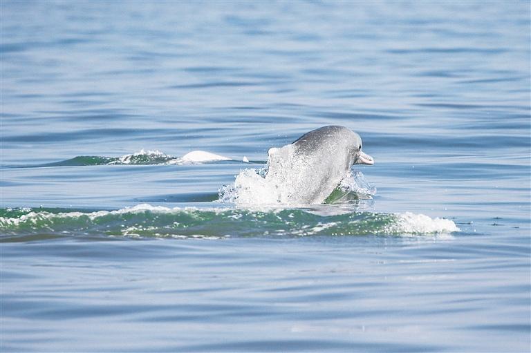 近日,中国科学院深海科学与工程研究所海洋哺乳动物研究团队在海南岛西南海域开展中华白海豚专项监测调查时,观测到一群规模较大的中华白海豚,现场估算数量约为30至50头。据介绍,该物种通常以少于10头的小群体活动为主,如此规模的群体属较为罕见的现象。图为2月4日拍摄的中华白海豚。新华社发