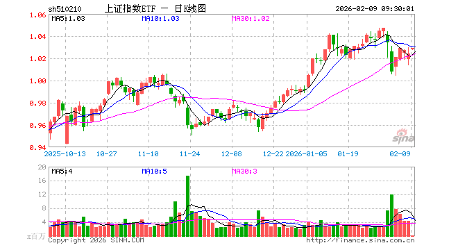 2月9日,上证指数ETF(510210)开盘涨0.39%,报1.028元。上证指数ETF(510210)重仓股方面,农业银行开盘跌0.60%,中国石油跌0.74%,贵州茅台涨0.20%,工业富联涨3.31%,中国银行跌0.37%,紫金矿业涨3.50%,中国神华涨0.48%,中国人寿涨1.37%,招商银行涨0.00%,中国平安涨0.82%。