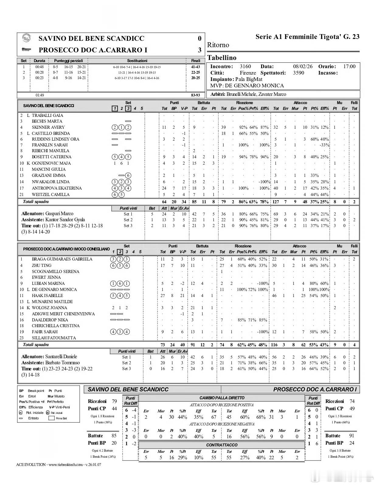 斯坎迪奇安娃24分(40扣17中1失误2被拦4拦3发)斯金纳11分(32扣10中5失误1被拦1拦39一传波塞蒂9分(20扣8中3被拦1发,19一传)琳达6分(15扣5中1被拦1拦)魏策尔5分(9扣4中1发)瓜姐4分(1拦3发)鲁丁斯3分(5扣3中1失误)格拉兹亚尼2分