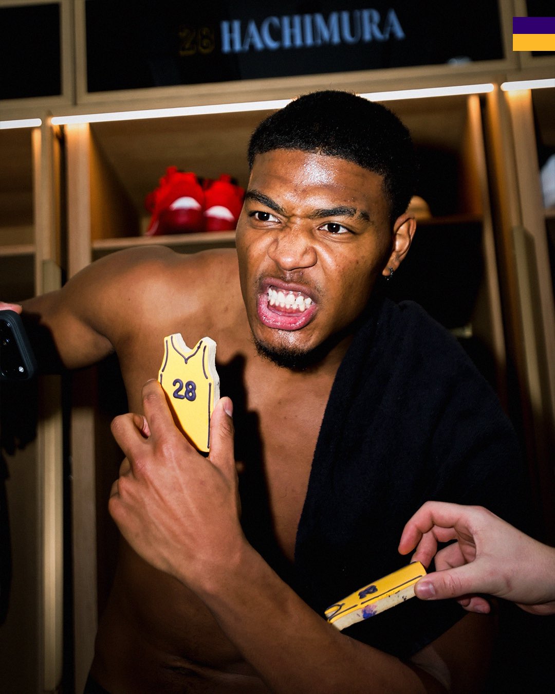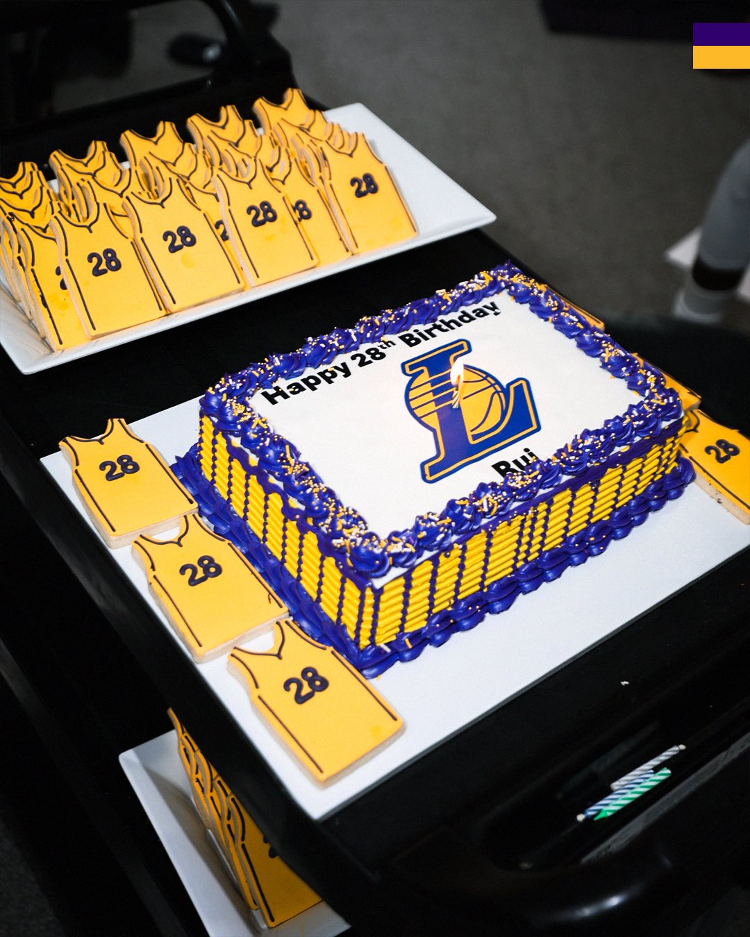 赛后,湖人准备了生日蛋糕并在更衣室内为八村垒庆生。