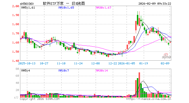 2月9日,软件ETF万家(560360)开盘涨1.08%,报1.594元。软件ETF万家(560360)重仓股方面,科大讯飞开盘涨1.72%,金山办公涨1.38%,同花顺涨1.68%,指南针涨1.17%,恒生电子涨1.61%,拓维信息涨1.88%,润和软件涨1.61%,三六零涨1.87%,软通动力涨1.93%。