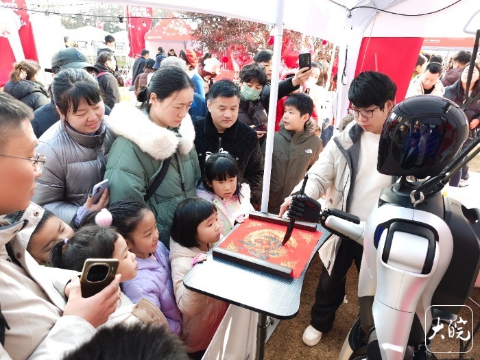 人形机器人写“福”字送市民。
