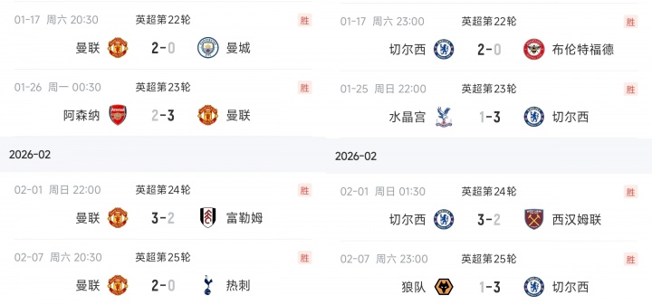 直播吧02月09日讯英超第25轮全部战罢,切尔西和曼联本轮均取胜。